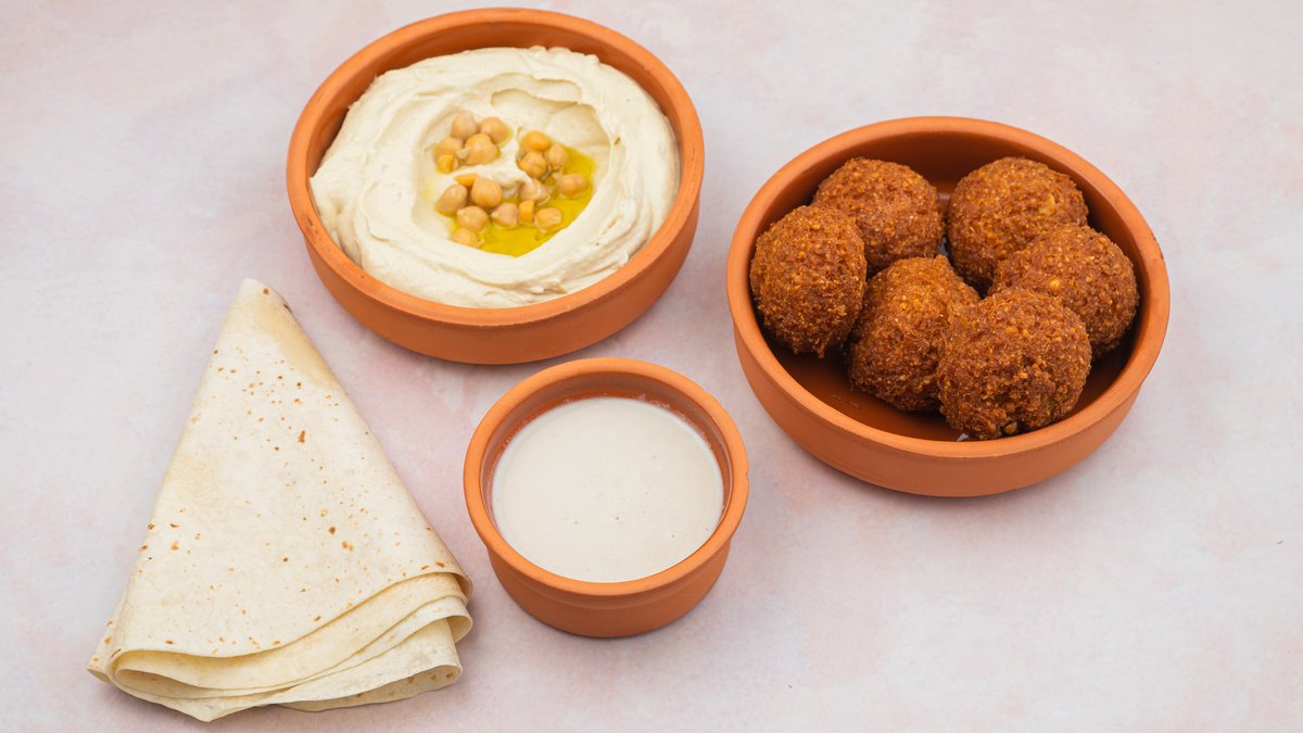 Falafel 300g (6 kom), humus pakovanje, tahini sos pakovanje, 2 saž tortilje
