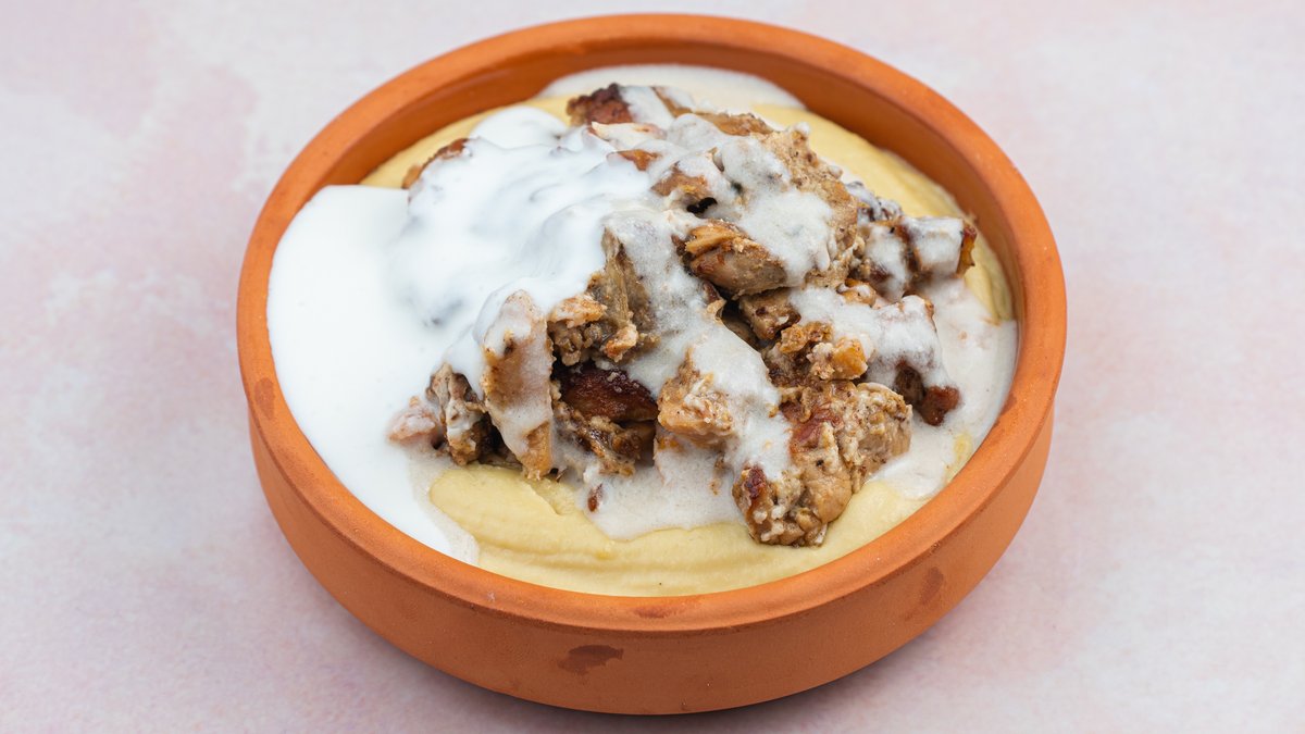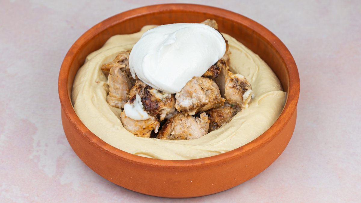 Marinirano pileće meso, humus, tahini sos, beli luk sos