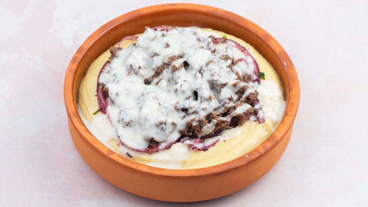 Juneća Šavurma Humus (marinirano juneće meso, crveni luk sa začinima i persunom, humus, tahini sos)
