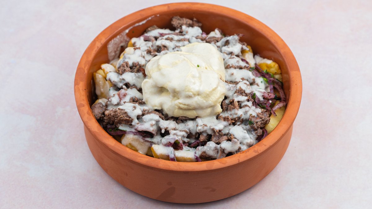 Juneća Šavurma Pomfrit (marinirano juneće meso, crveni luk sa začinima i persunom, pomfrit, tahini sos)