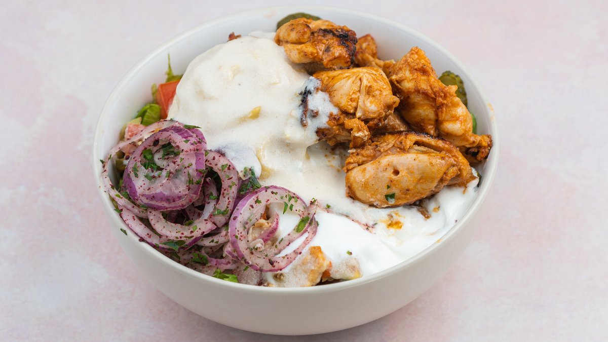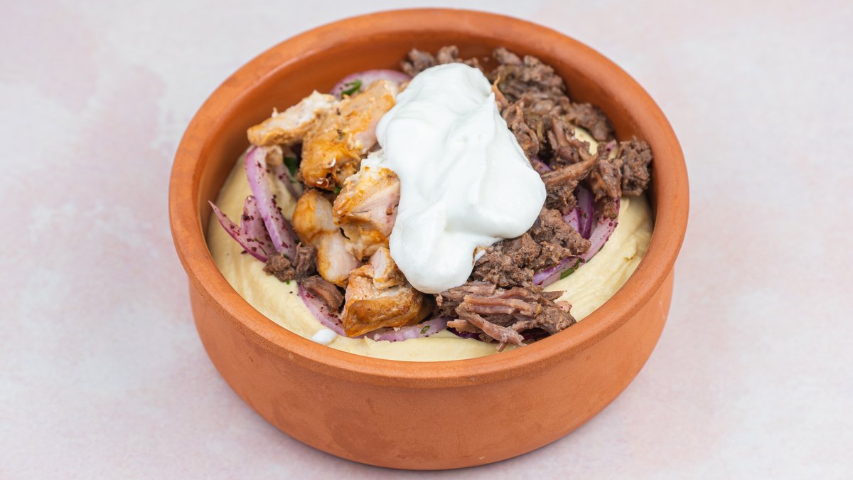 Mix pileća i juneća Šavurma Humus (marinirano juneće i pileće meso, humus, crveni luk sa začinima I persunom, tahini sos, beli luk sos)
