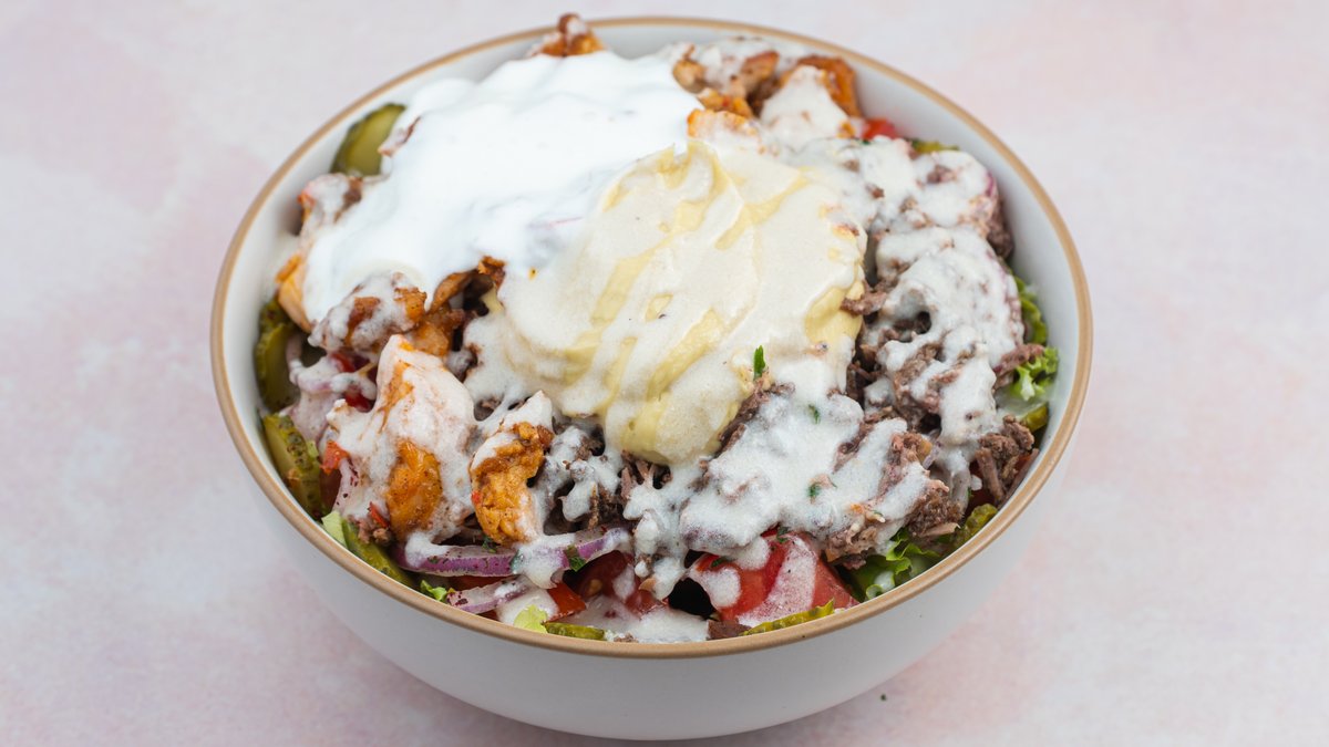 Mix pileća i juneća Šavurma Salata (marinirano juneće i pileće meso, hummus, tahini sos, beli luk sos, zelena salata, kiseli krastavci, crveni luk sa začinima i persunom, paradajz )