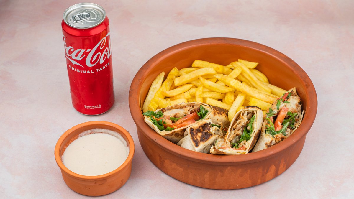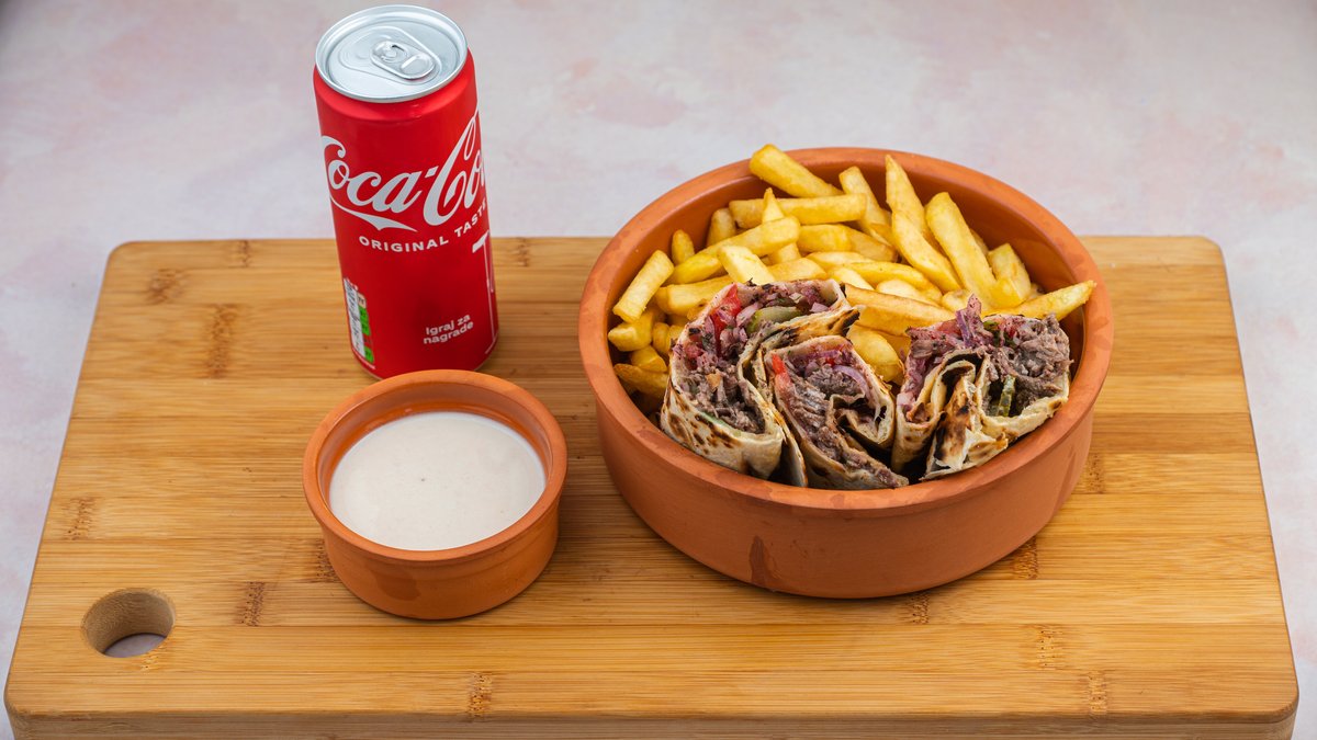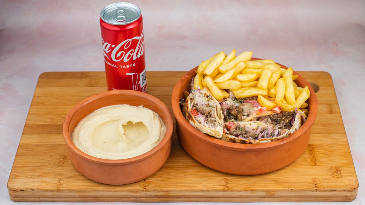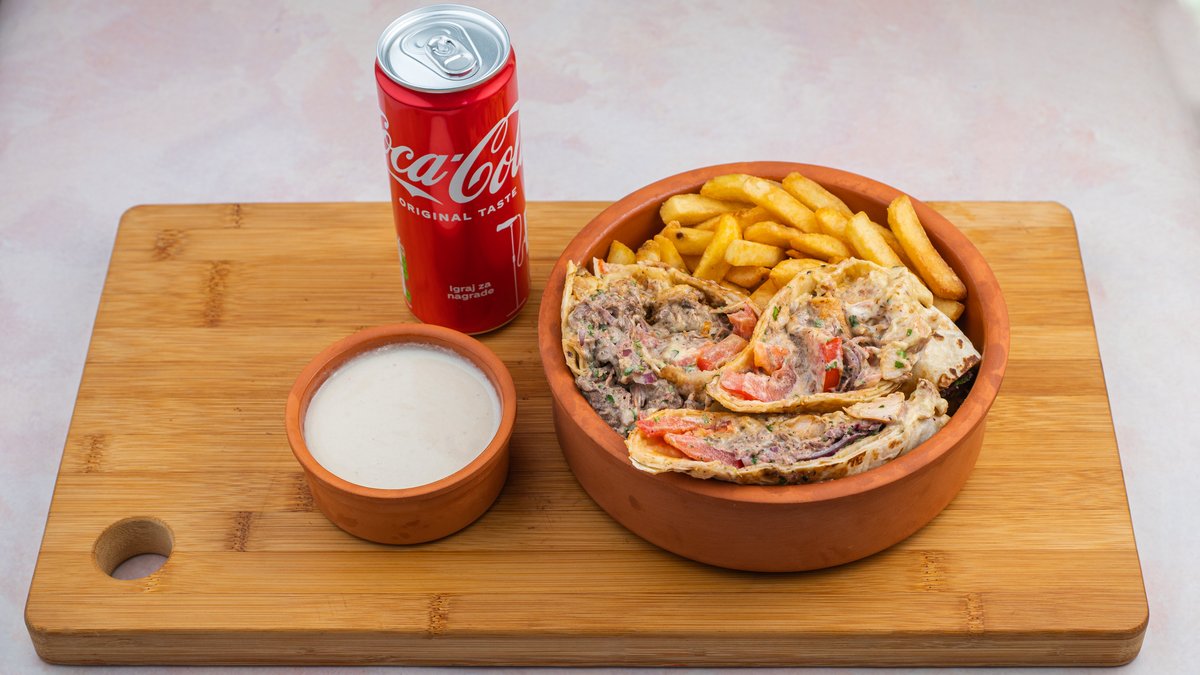 Marinirano juneće i pileće meso, paradajz, začinjeni crveni luk sa peršunom, kiseli krastavci, humus, tahini, beli luk sos. Uz jelo dobijate pomfrit + sos po izboru + piće po izboru.