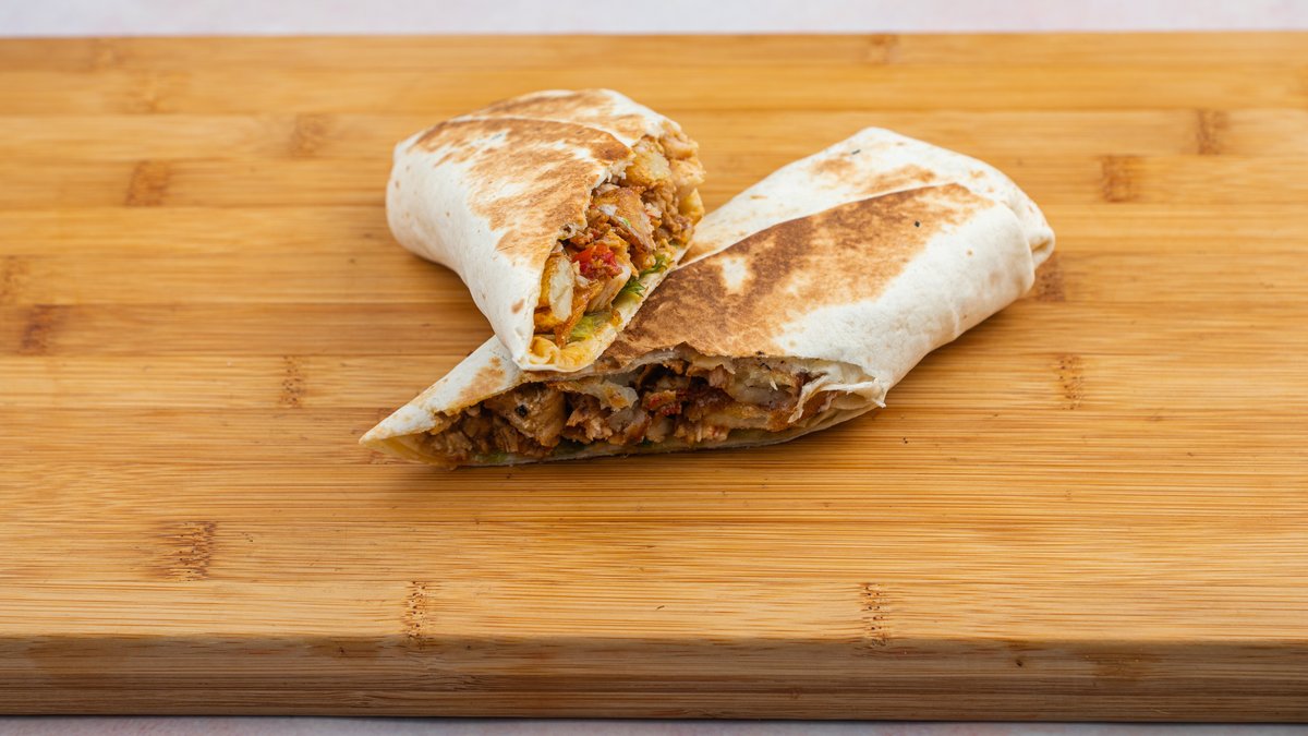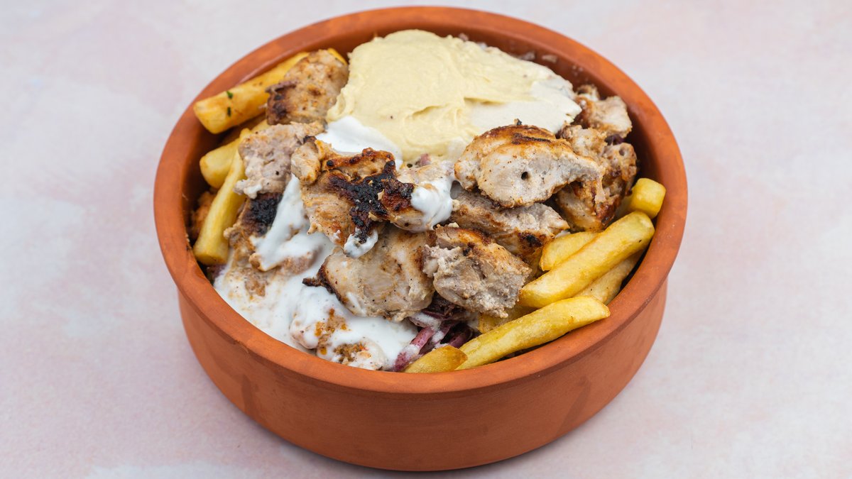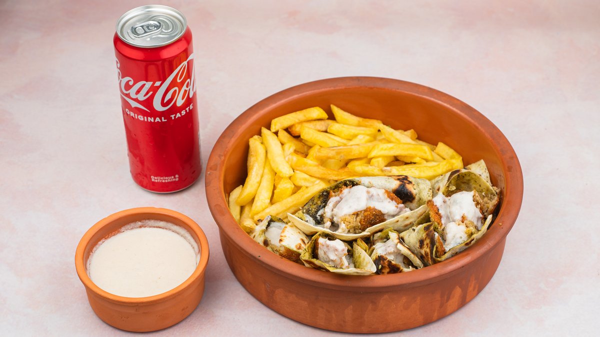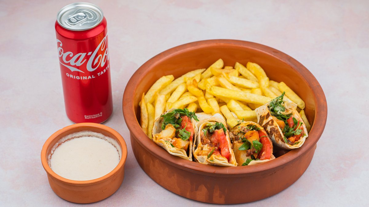 Marinirano juneće i pileće meso, paradajz, začinjeni crveni luk sa peršunom, kiseli krastavci, humus, tahini, beli luk sos. Uz jelo dobijate pomfrit + sos po izboru + piće po izboru.