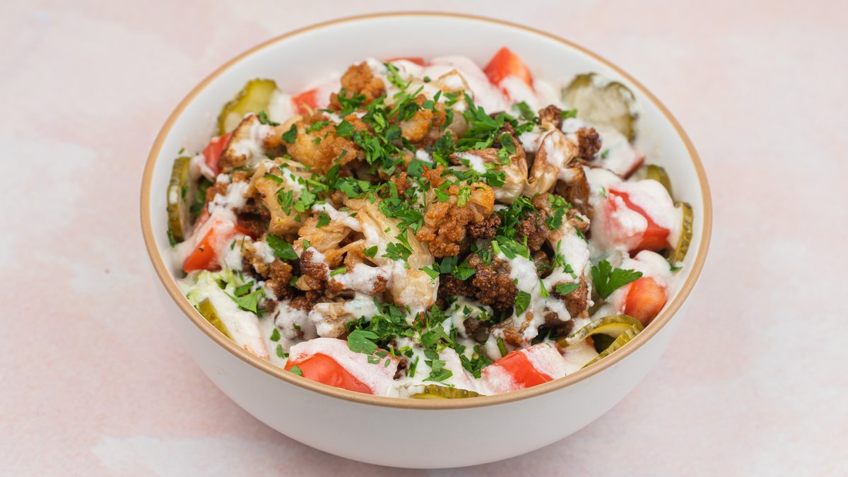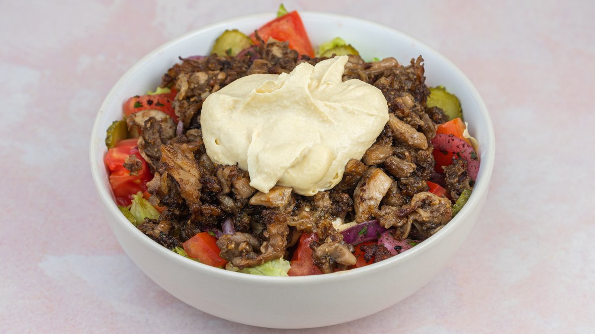 Juneća Šavurma Salata (marinirano juneće meso, zelena salata, paradajz, kiseli krastavci, crveni luk sa začinima i peršunom, humus, tahini sos)