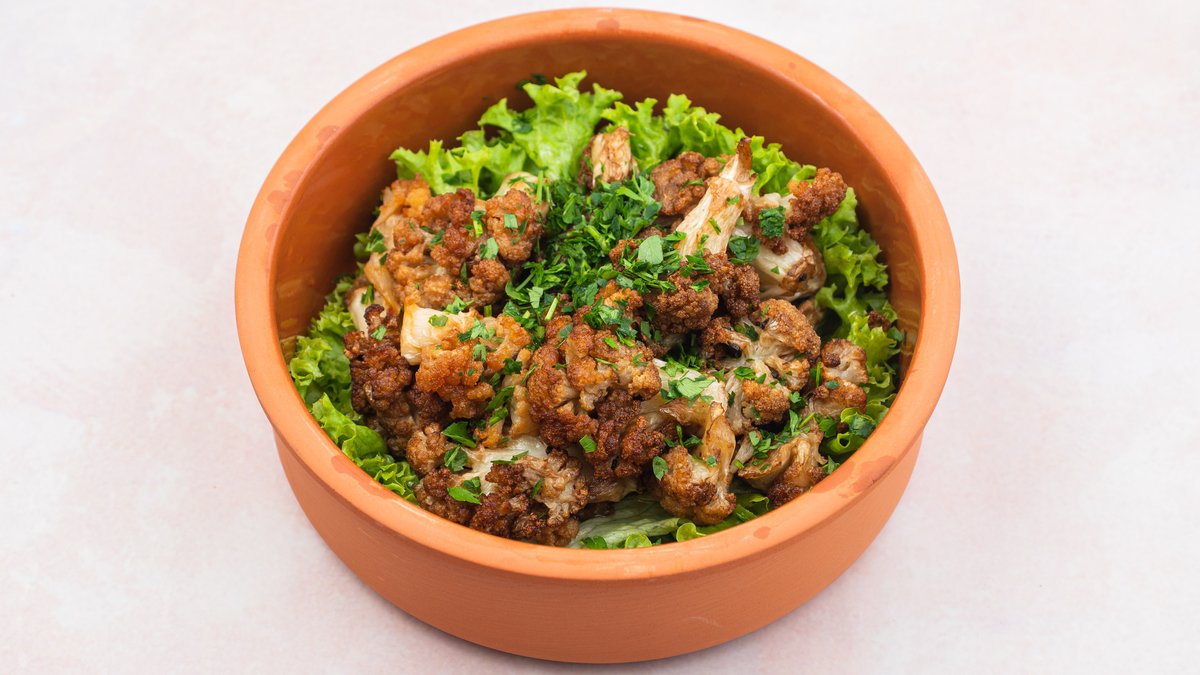 Posno - karfiol, humus, tahini, rukola. Uz jelo dobijate pomfrit + sos po izboru + piće po izboru.