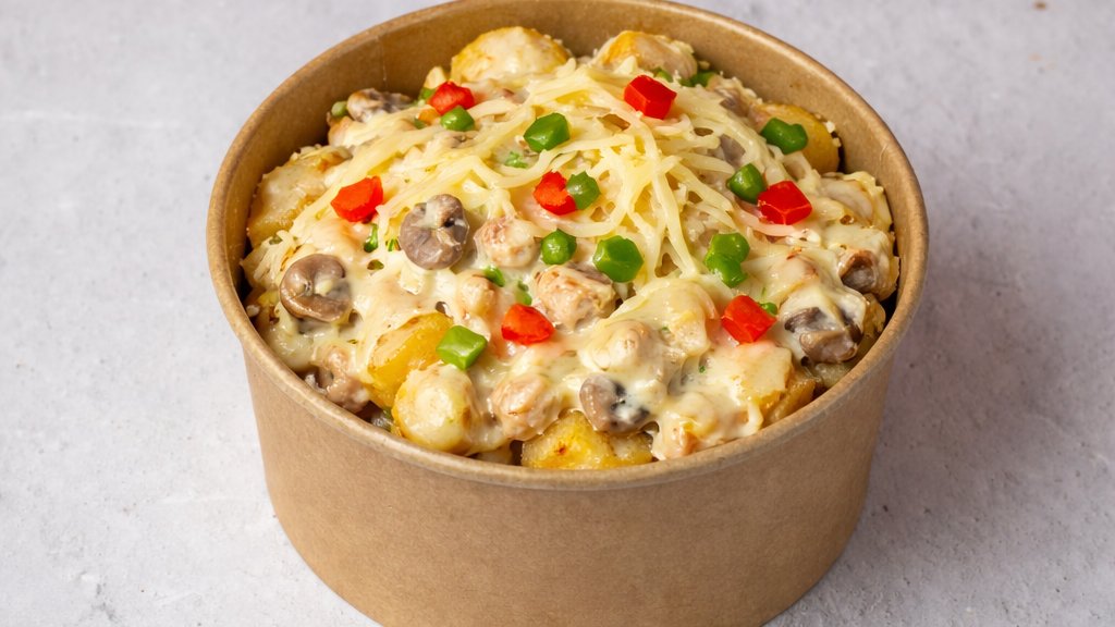 Krompir, piletina krem sosu sa pečurkama, kačkavalj i paprika