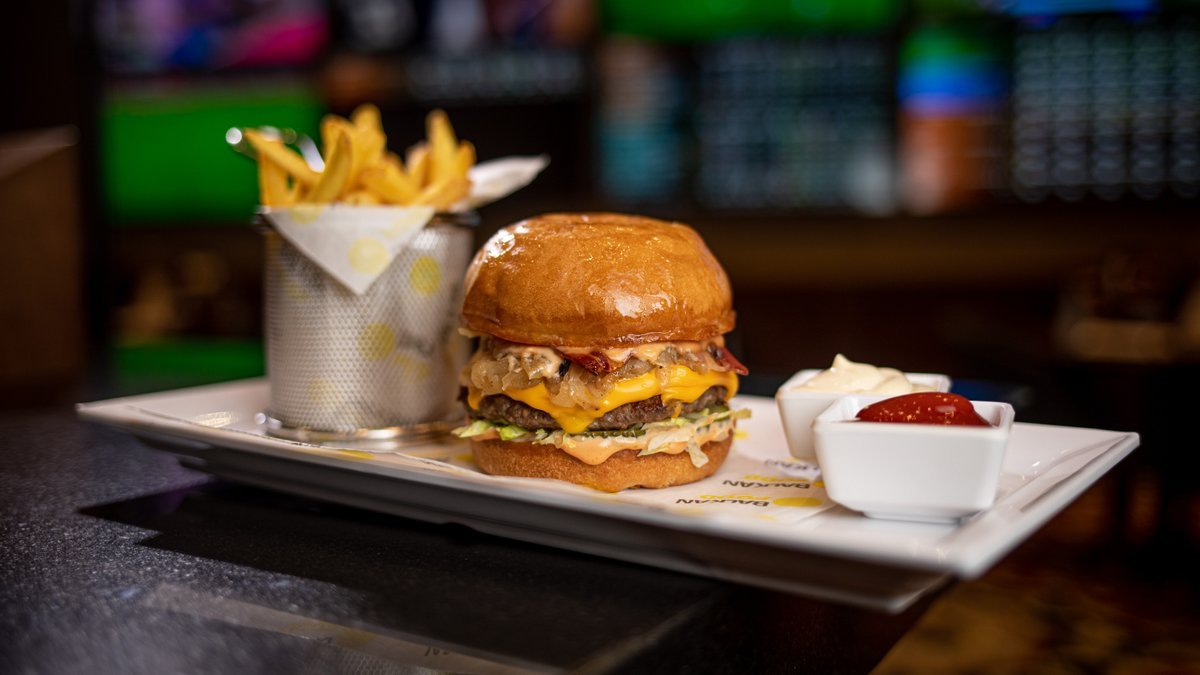 Čisto premium juneće meso (140g), hrskava slanina, cheddar sir, karamelizovani luk, kiseli krastavčići, iceberg salata, BF burger sos. Služi se sa pomfritom (200g), kečapom i majonezom.