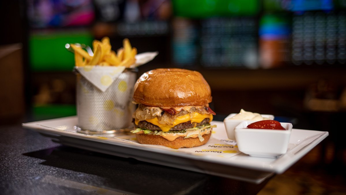 Čisto premium juneće meso (140g), hrskava slanina, cheddar sir, karamelizovani luk, kiseli krastavčići, iceberg salata, BF burger sos. Služi se sa pomfritom (200g), kečapom i majonezom.
