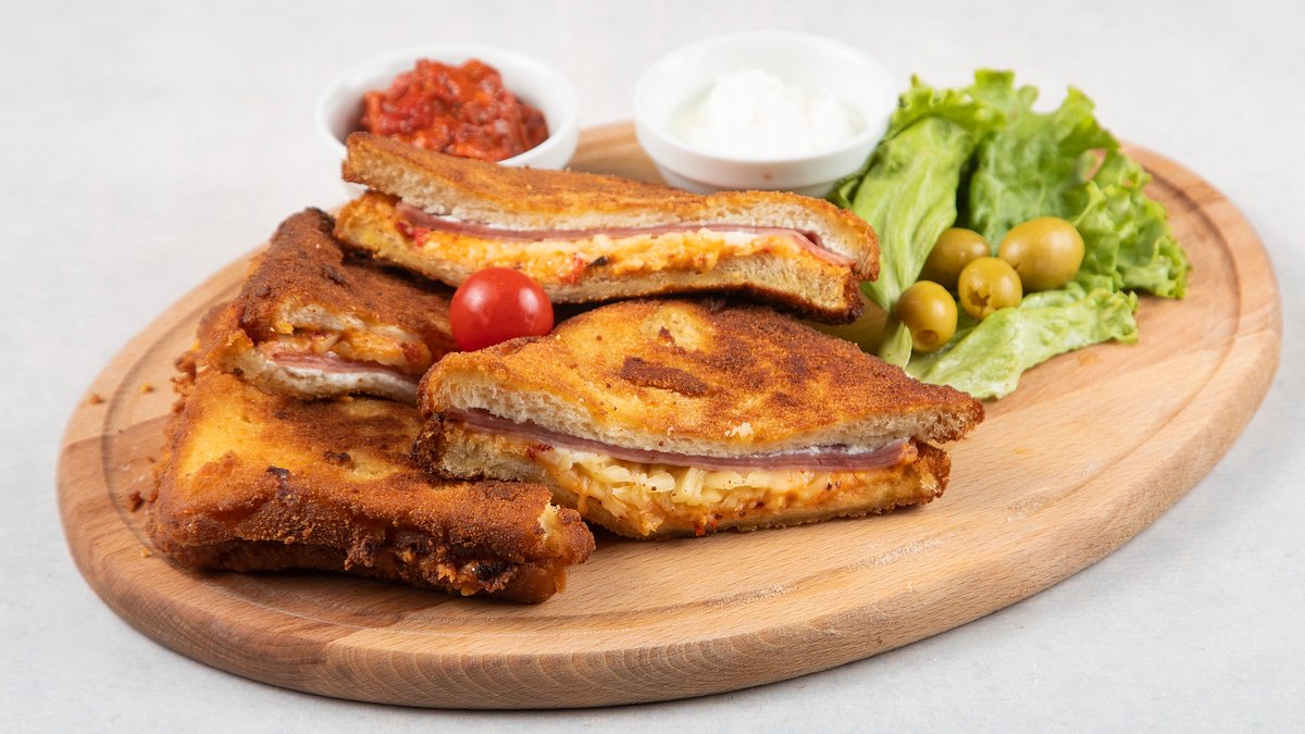 tost, pavlaka, kačkavalj, šunka, ajvar, maslinke