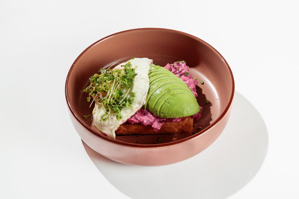 Tzatziki od cvekle, avokado, jaje na oko, mikro bilje, crni susam. Gr: 320 | Kcal: 490 | P: 15g | UH: 42g | M: 31g. Nutritivne vrednosti su informativnog karaktera i bazirane su na prosečnim vrednostima sastojaka.