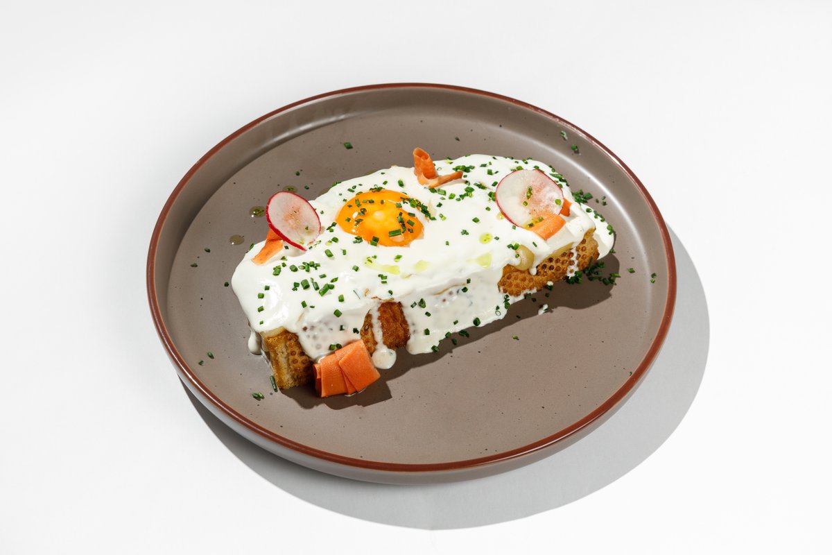 Šunka, dijon med, parmezan, boujal sir, jaje, bešamel, rukola. Gr: 350 | Kcal: 750 | P: 32g | UH: 48g | M: 46g. Nutritivne vrednosti su informativnog karaktera i bazirane su na prosečnim vrednostima sastojaka.