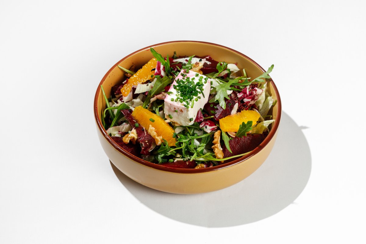 Kuvana cvekla, spanać, grilovani koziji sir, lešnik, aćeto, mikro bilje, biftek pomorandže. Gr: 300 | Kcal: 380 | P: 14g | UH: 24g | M: 26g. Nutritivne vrednosti su informativnog karaktera i bazirane su na prosečnim vrednostima sastojaka.