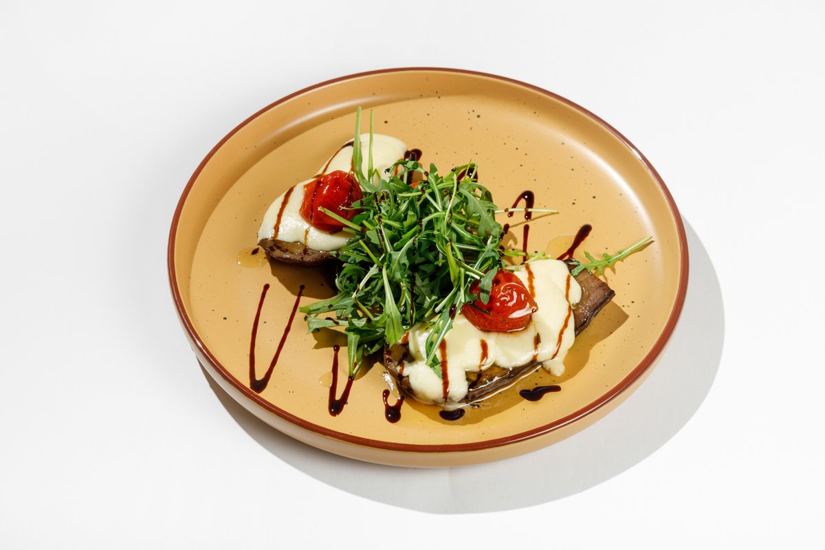 Patlidžan, brie sir, salsa od paradajza, rukola, parmezan, bosiljak. Gr: 350 | Kcal: 420 | P: 18g | UH: 22g | M: 30g. Nutritivne vrednosti su informativnog karaktera i bazirane su na prosečnim vrednostima sastojaka.