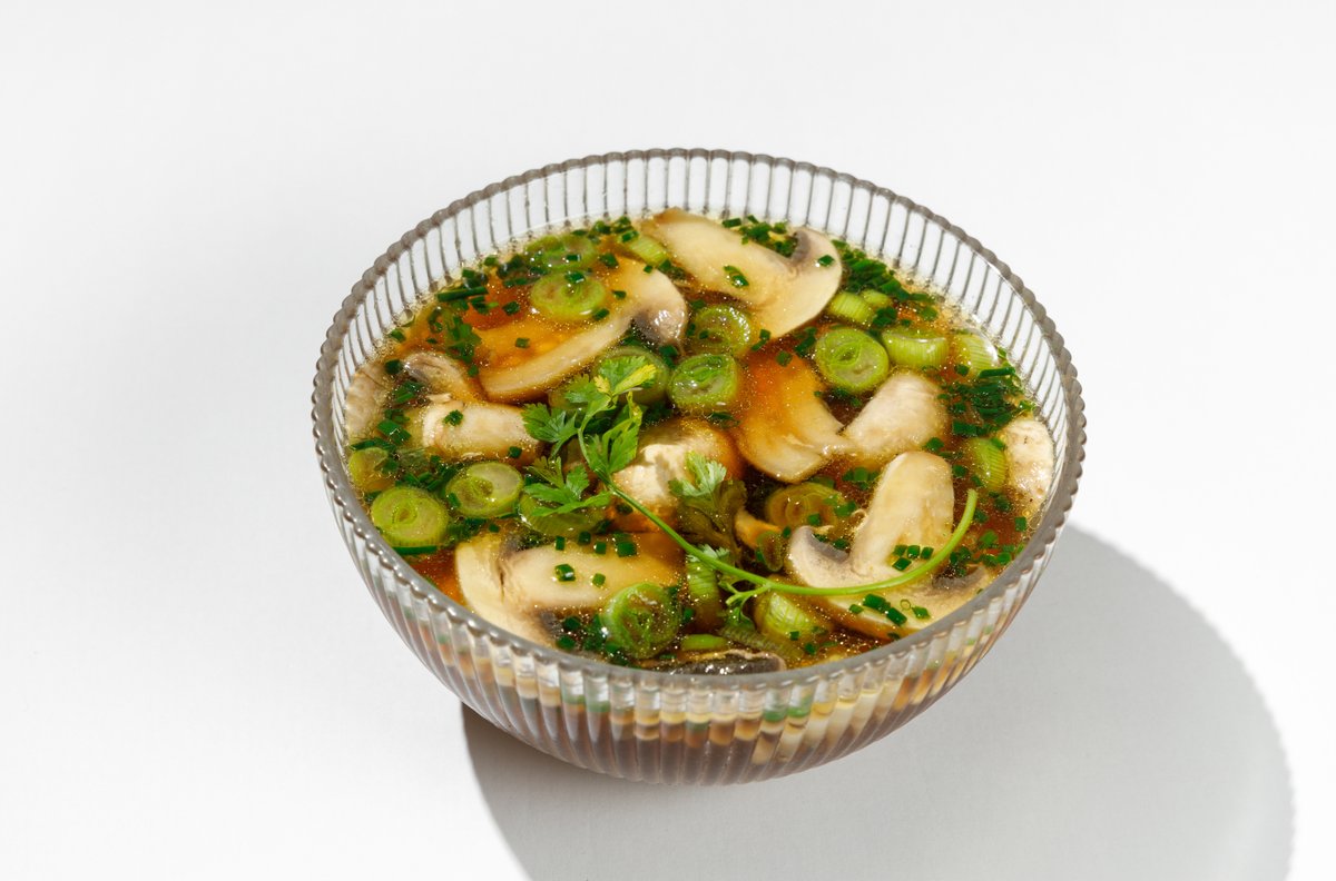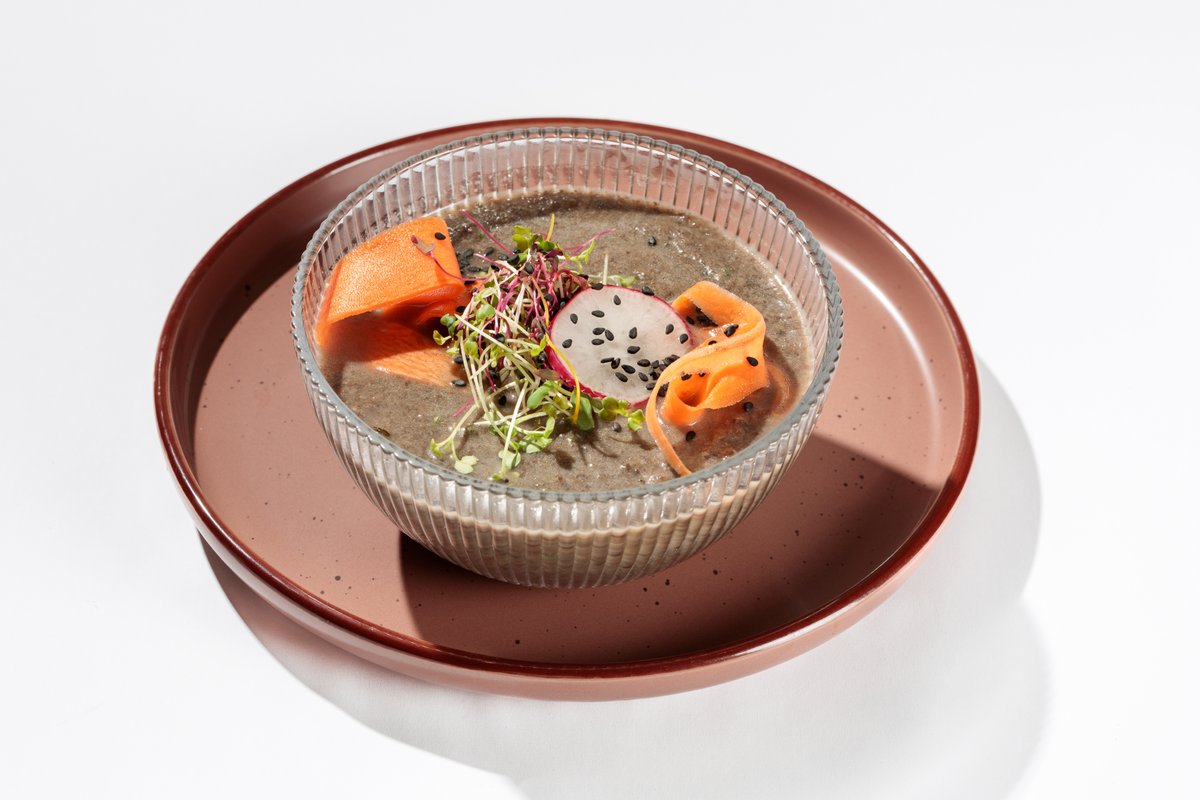 Šitake pečurke, mladi luk, peršun, dimljeni tofu, mikro bilje. Gr: 350 | Kcal: 180 | P: 12g | UH: 15g | M: 8g. Nutritivne vrednosti su informativnog karaktera i bazirane su na prosečnim vrednostima sastojaka.
