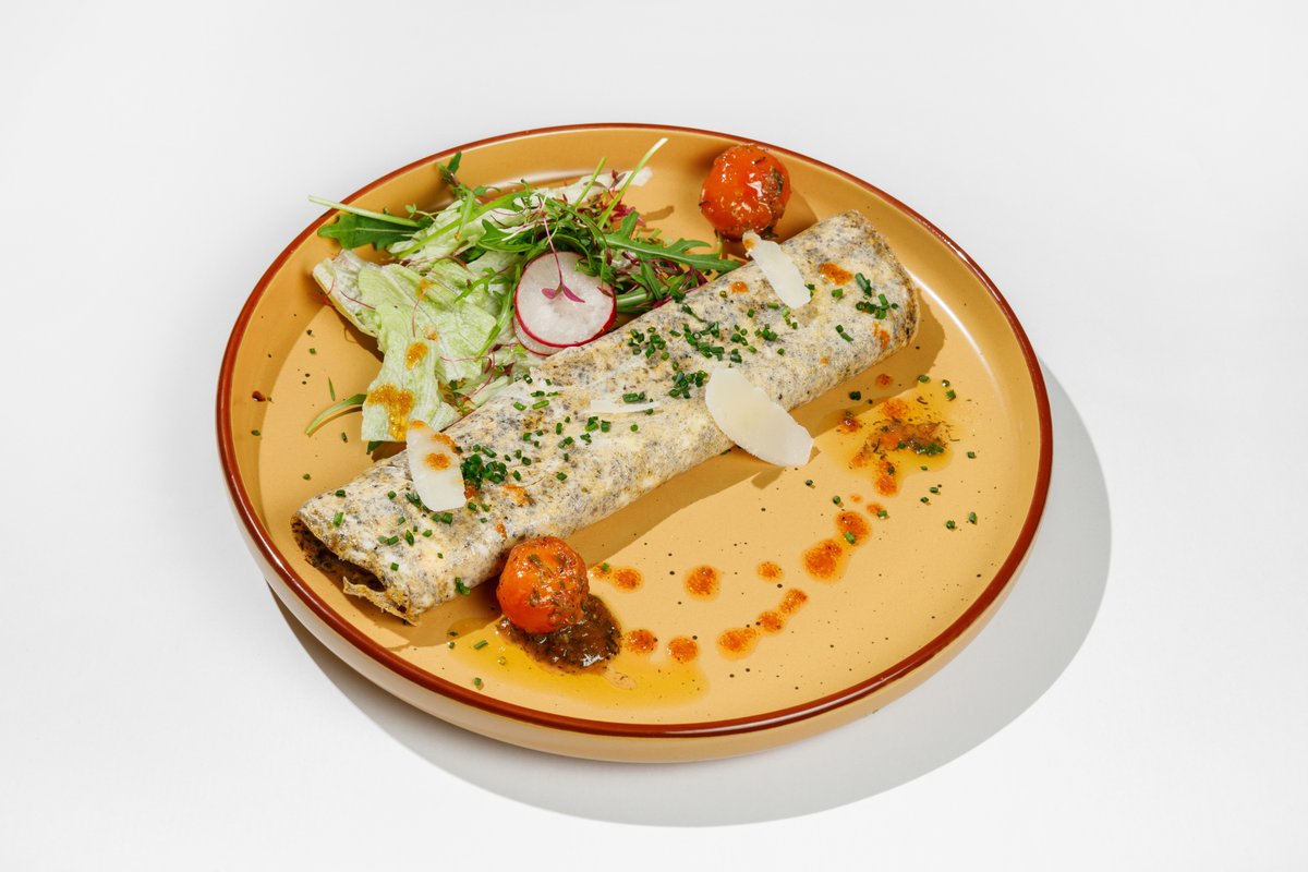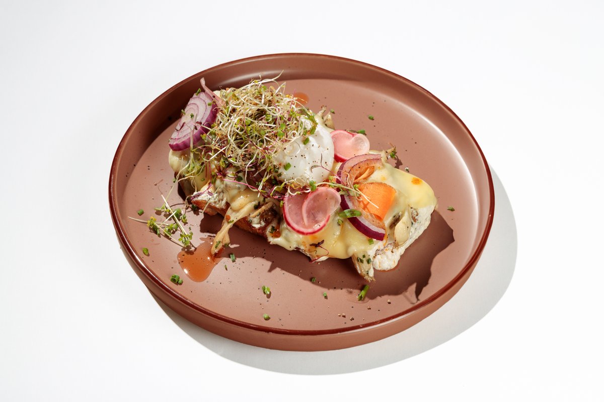 Avokado, kremasta kajgana, salsa od paradajza, svež bosiljak, parmezan, mikro bilje, ulje od vlašca. Gr: 350 | Kcal: 580 | P: 22g | UH: 38g | M: 38g. Nutritivne vrednosti su informativnog karaktera i bazirane su na prosečnim vrednostima sastojaka.