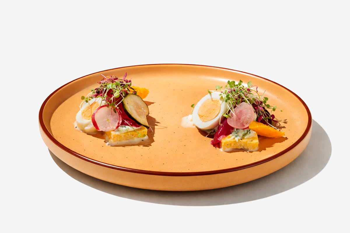 Mileram-ren, kraljevske bukovače, poširano jaje, kondimenti pomorandže i limuna, konfit paradajz, boujal sir. Gr: 350 | Kcal: 520 | P: 19g | UH: 40g | M: 32g. Nutritivne vrednosti su informativnog karaktera i bazirane su na prosečnim vrednostima sastojaka.