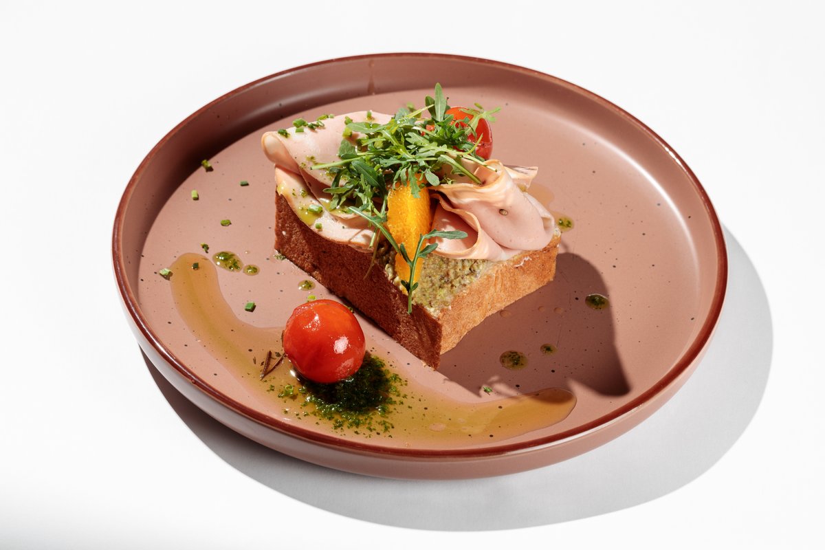 Krema od pistaća, konfit paradajz, mocarela, rukola, ulje od sušenog paradajza. Gr: 300 | Kcal: 680 | P: 24g | UH: 34g | M: 50g. Nutritivne vrednosti su informativnog karaktera i bazirane su na prosečnim vrednostima sastojaka.