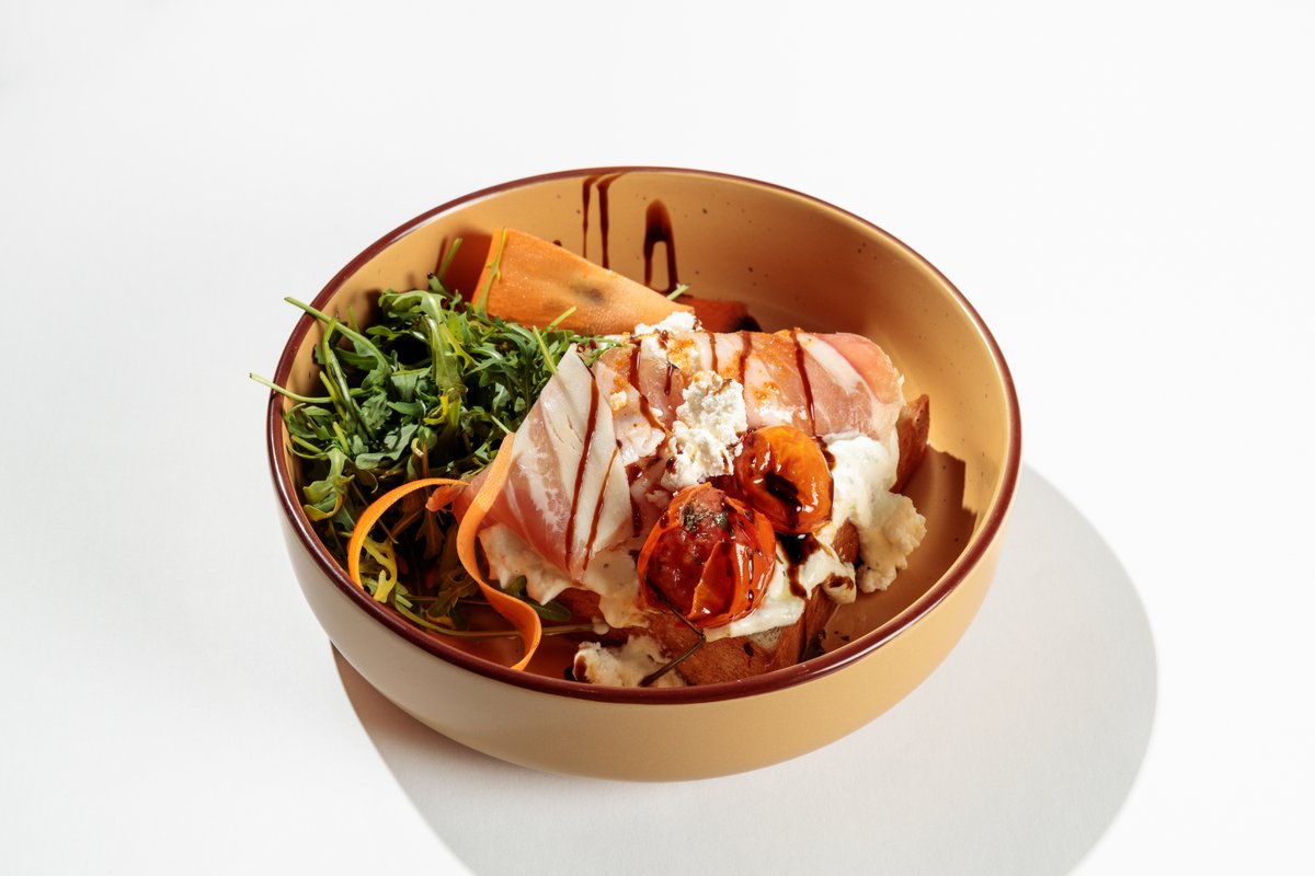 Rikota sa začinima, grilovani koziji sir, pršuta, konfit paradajz, rukola, parmezan, mikro bilje, sušeni čeri. Gr: 320 | Kcal: 620 | P: 28g | UH: 36g | M: 41g. Nutritivne vrednosti su informativnog karaktera i bazirane su na prosečnim vrednostima sastojaka.