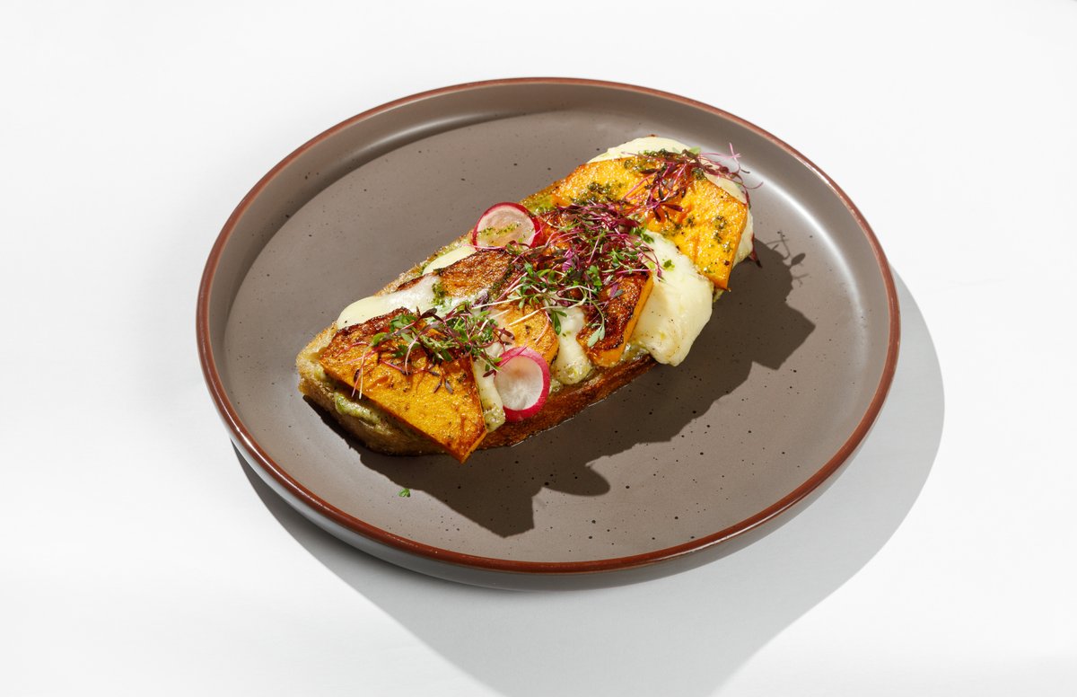 Humus od spanaća, grilovana bundeva, kokosov sir, kiseli luk. Gr: 300 | Kcal: 410 | P: 12g | UH: 48g | M: 18g. Nutritivne vrednosti su informativnog karaktera i bazirane su na prosečnim vrednostima sastojaka.