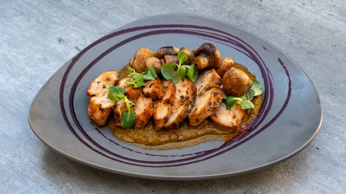 Suvidirana piletina sa origano zacinom, marinirani sampinjoni, domaci pelat, sos od bosiljka.