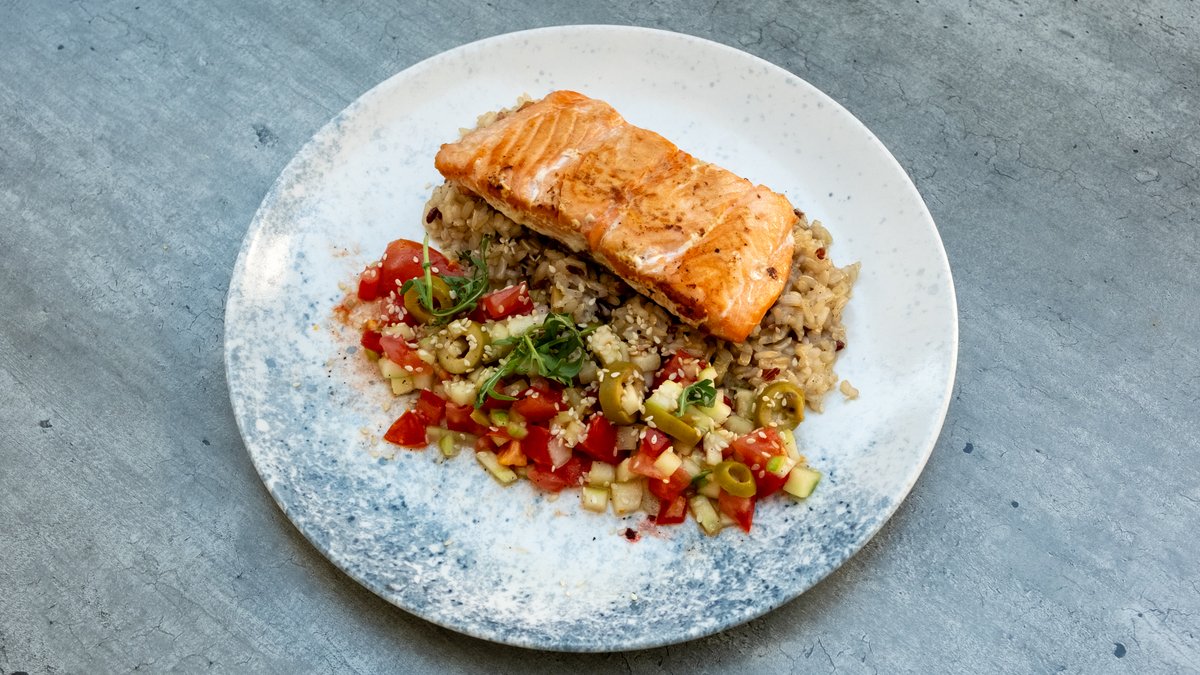 Grilovani file lososa, integralna riza,, salsa sa paradajzom, krastavcem i maslinama