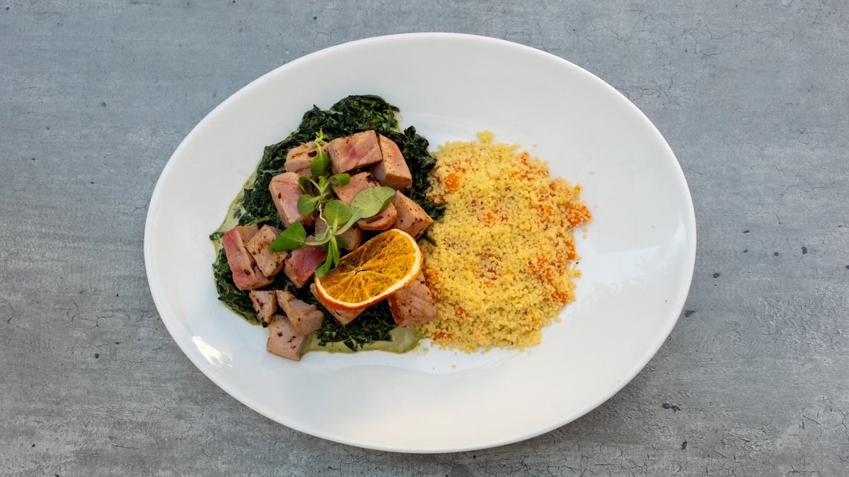 Tuna u kockama marinirana citrusnim sokom, kremasti spanac, kus kus