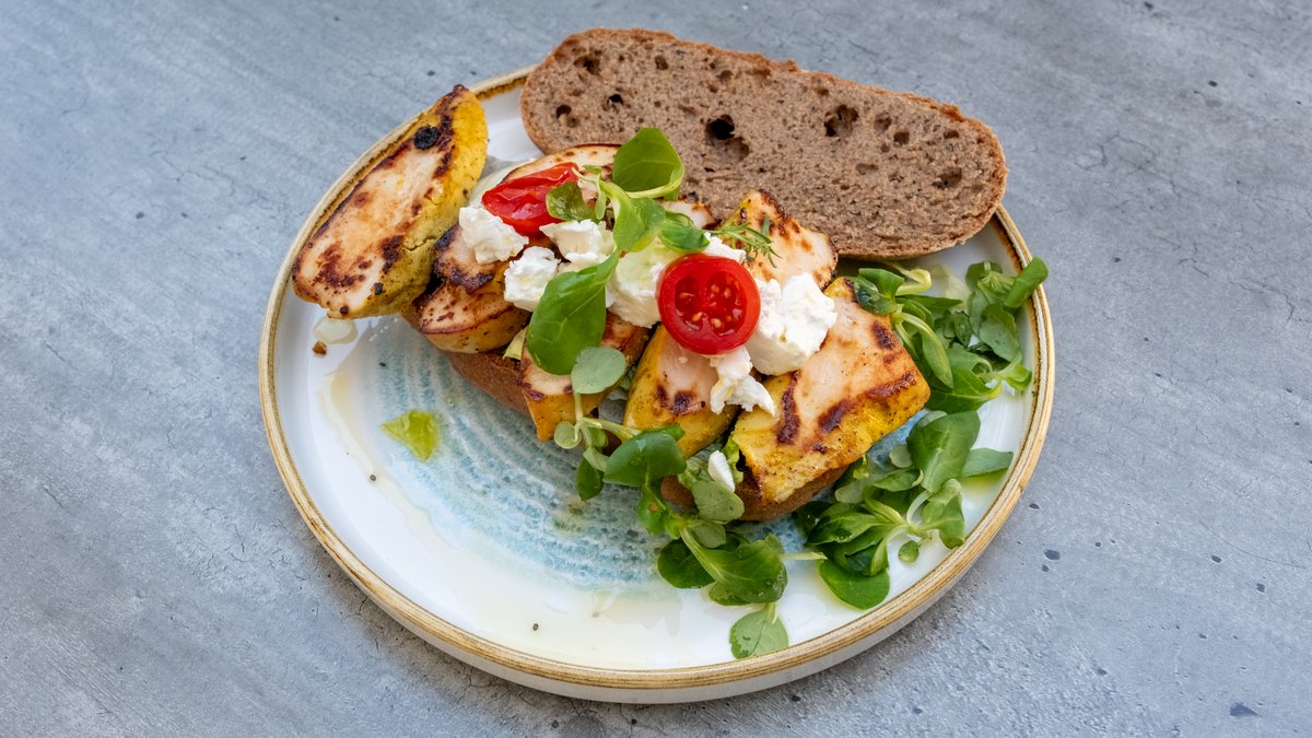 Zemicka od spelte, piletina, kozji sir, mix salata
