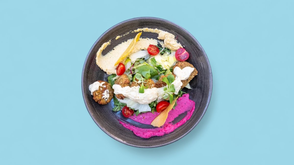 Batat krompir, kuvane leblebije, rukola, cherry paradaj i tahini dresing