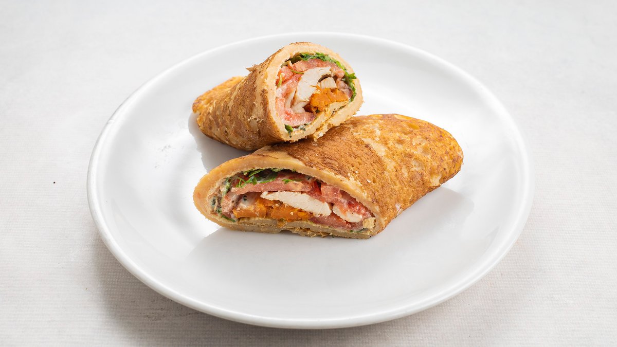 Tortilja od ovsa, pileći batak, kupus crveni, tzatziki sa grčkim jogurtom i pečeni batat pomfrit