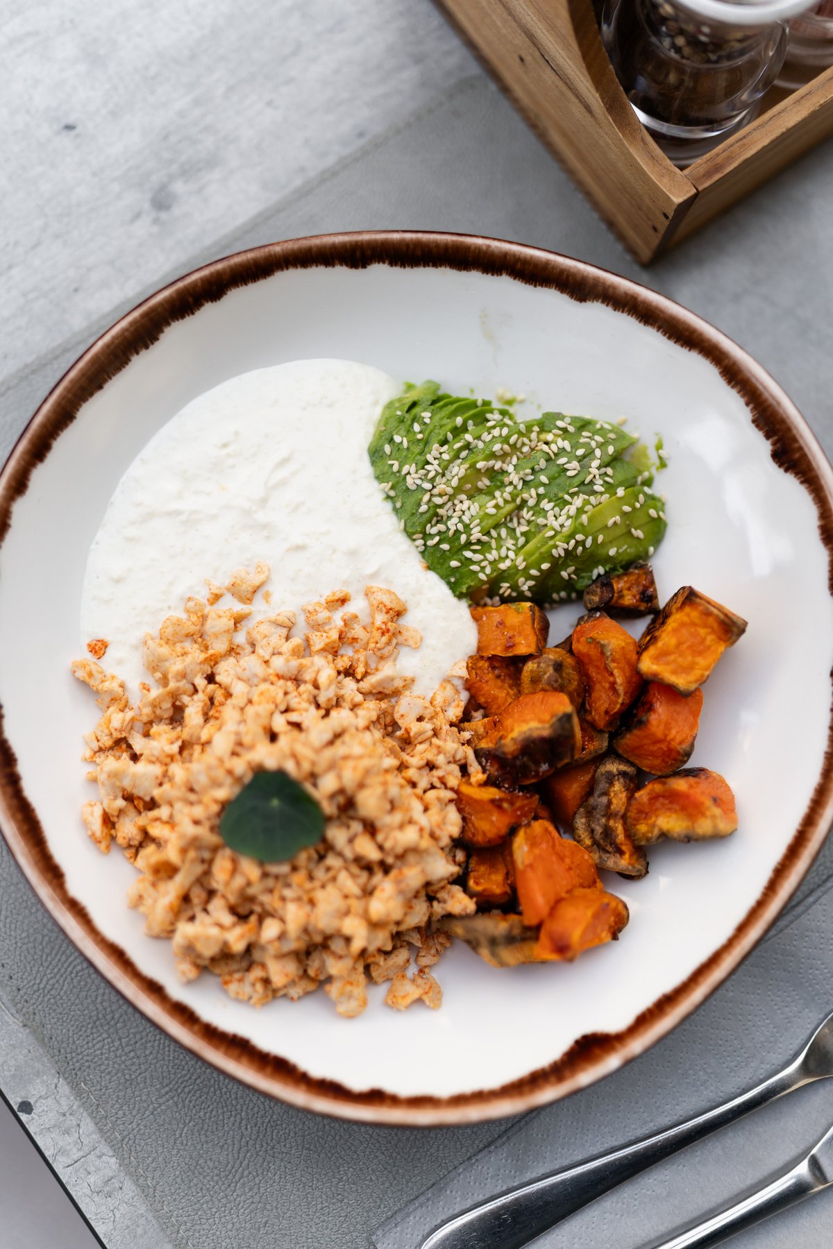 Mlevena curetina, batat kocke, šećerac, peršun, grašak, parmezan, sos na bazi grčkog jogurta i veganskog majoneza C 29, P 55, F 21, Cal 534