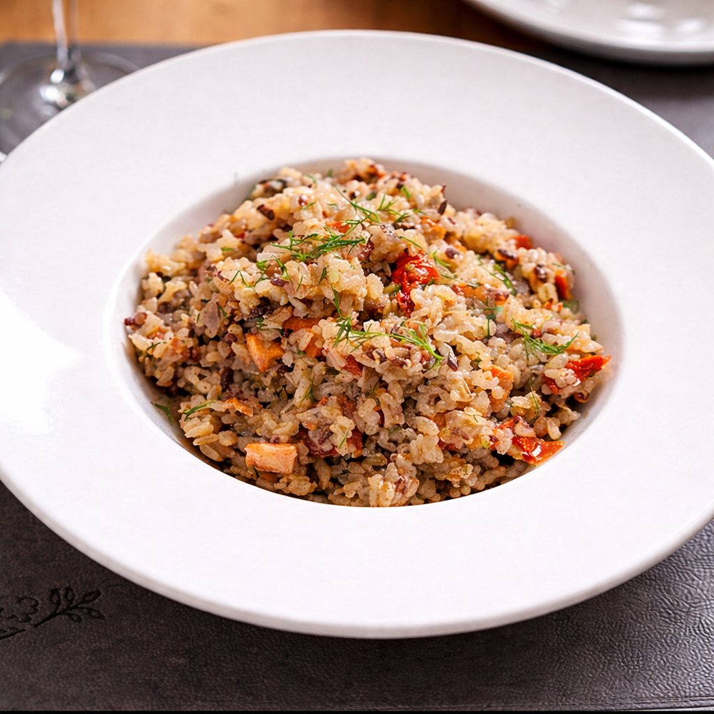 Grilovani file lososa, integralna riza,, salsa sa paradajzom, krastavcem i maslinama