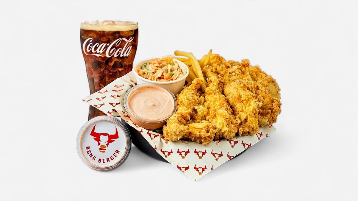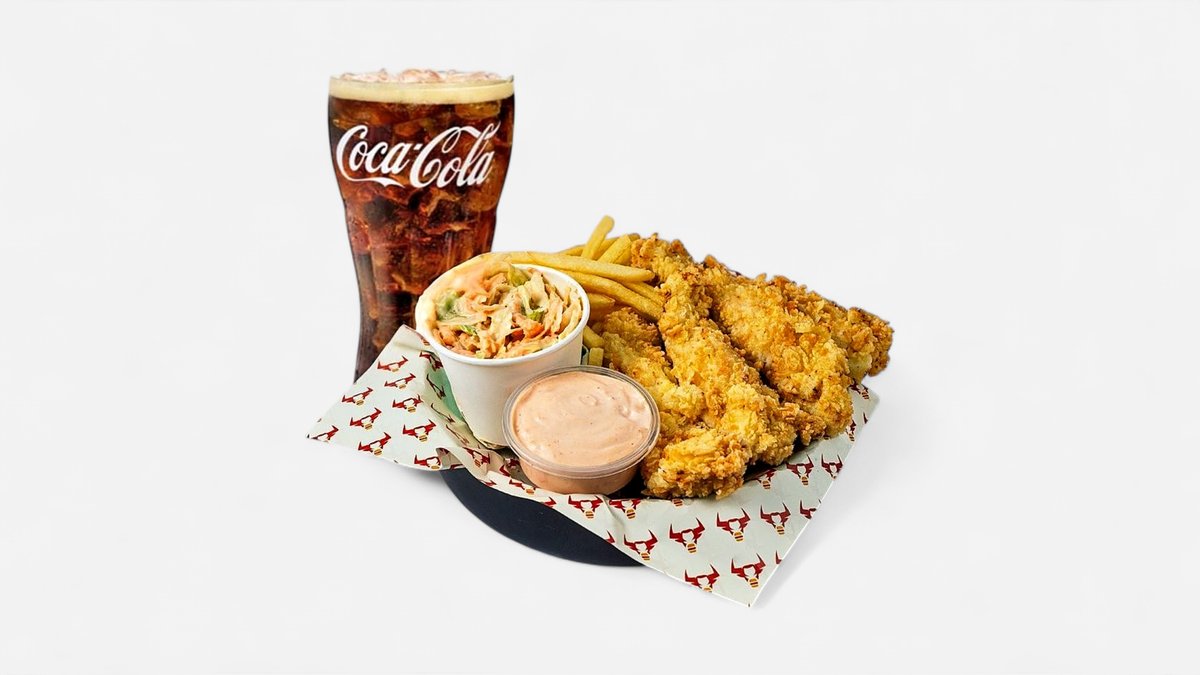 6x chicken tenders, pomfrit, 2x beng sos, coleslaw, Coca Cola
