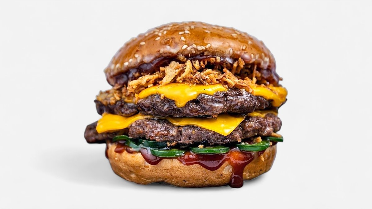 jalapeno paprika, BBQ sos, čedar sir, hrskavi luk, 2x130g mesa od 100 % junetine