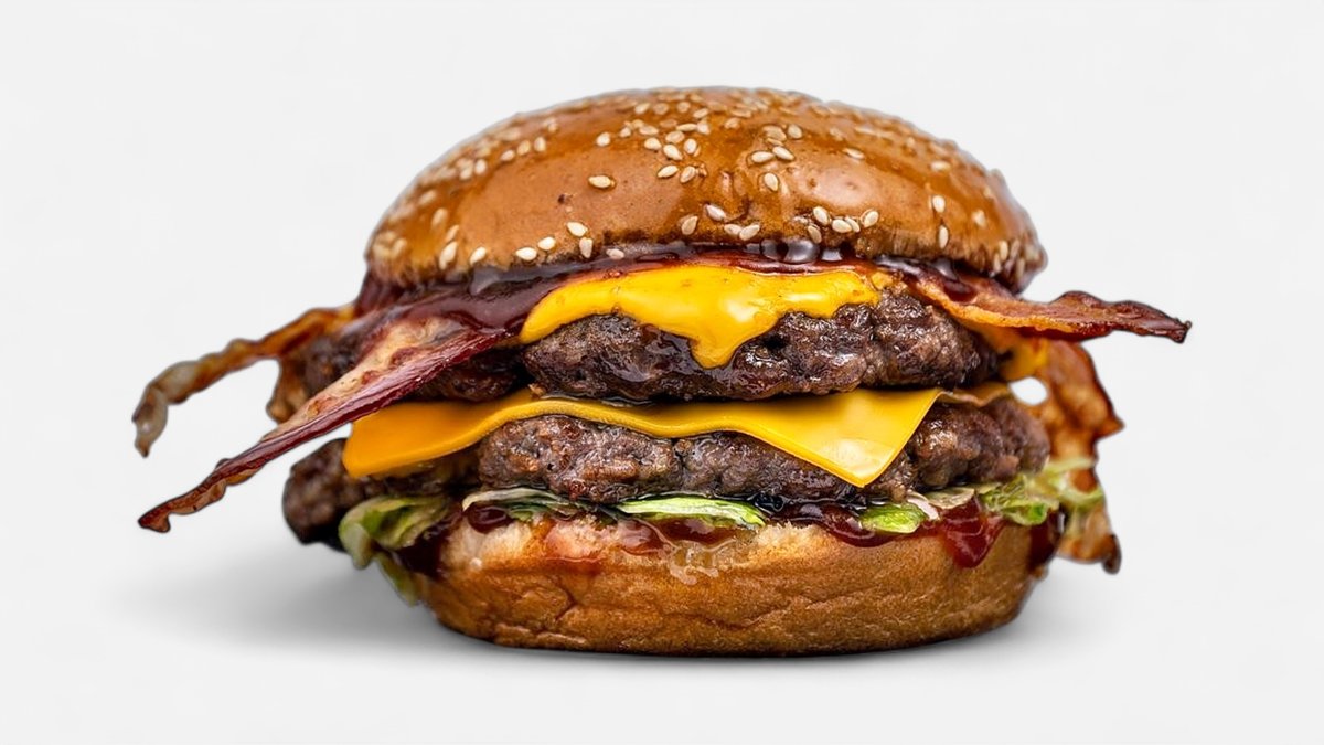 Dupla slanina, ajzberg, BBQ sos, ćedar sir, 2x130g mesa od 100 % junetine