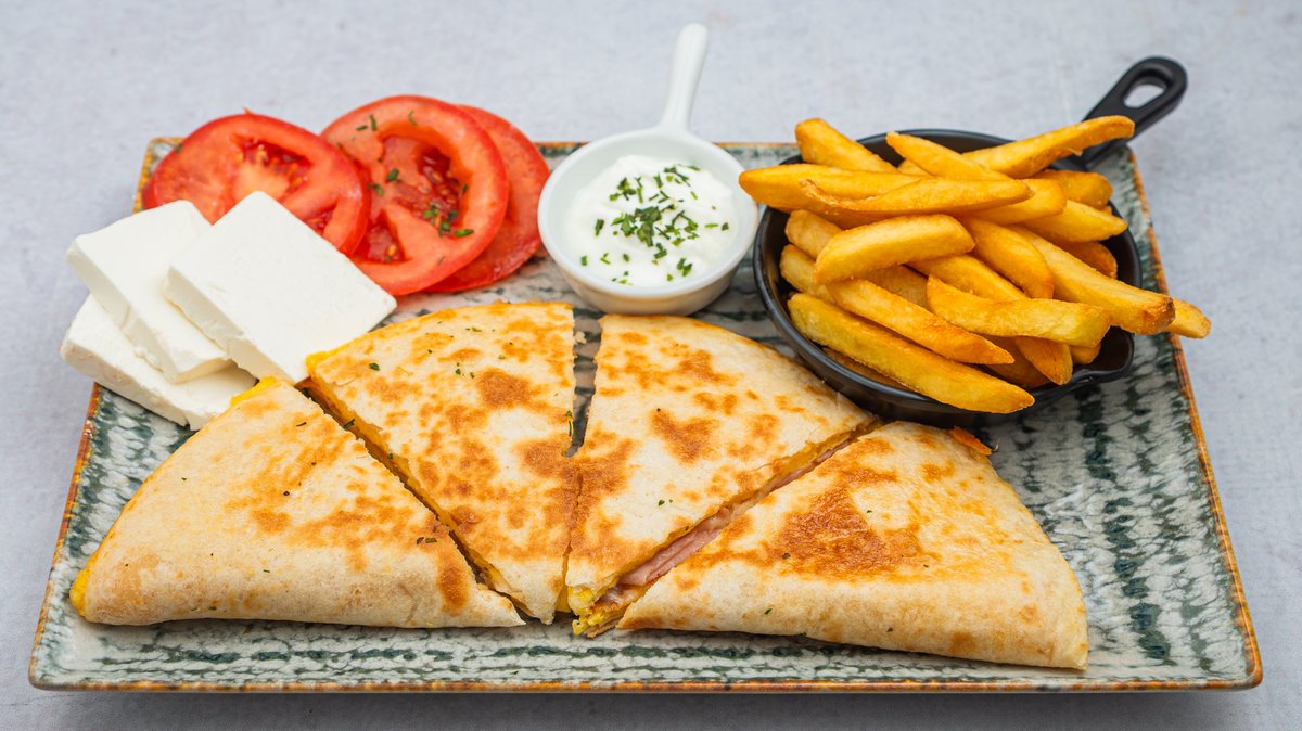 3 jaja, tortilja, šunka, kačkavalj, pavlaka, salata, pomfrit