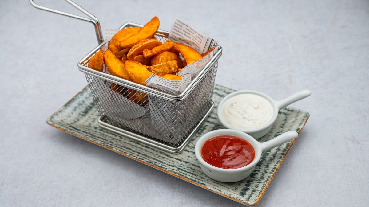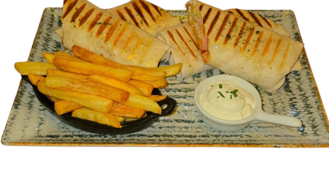 Šunka, topljeni cheddar, kačkavalj, mozzarella, salata, Bergamot sos, pomfrit