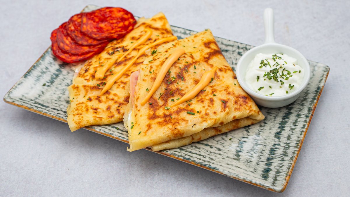 Šunka, kačkavalj, mozzarella, pavlaka, Bergamot sos, salata
