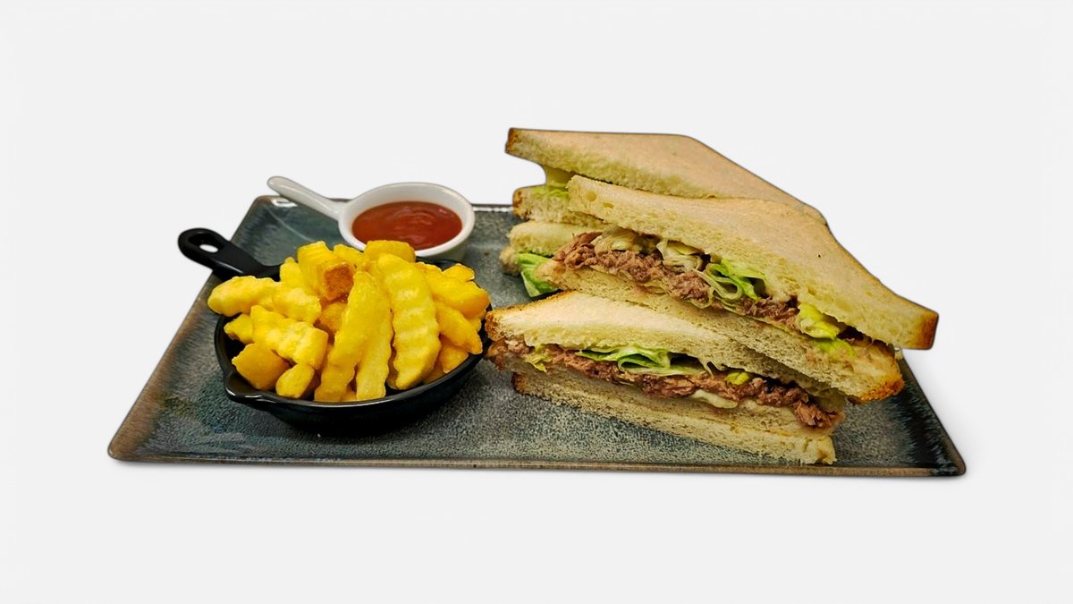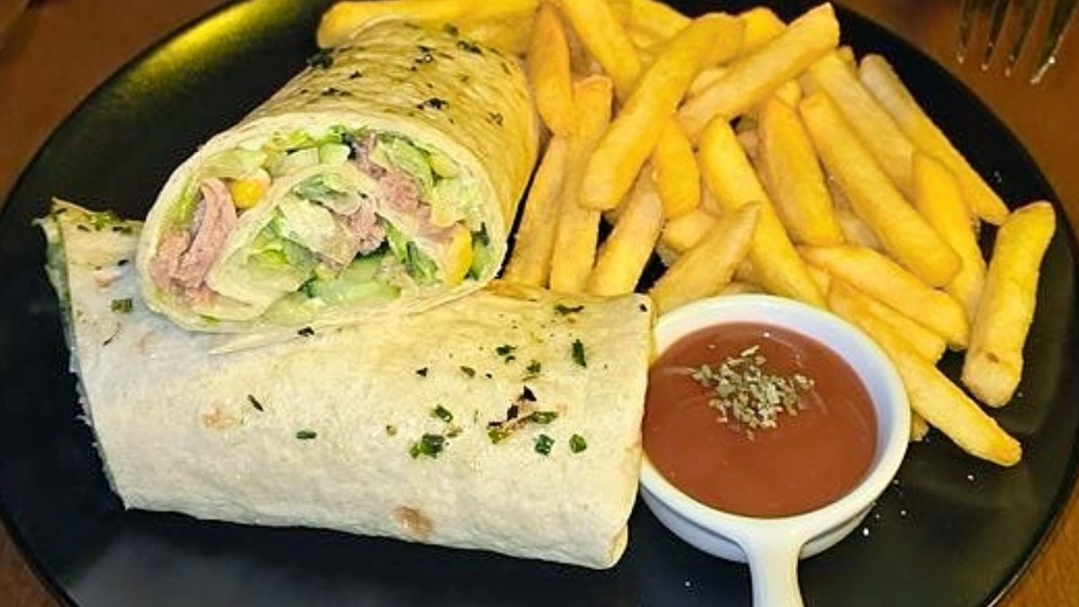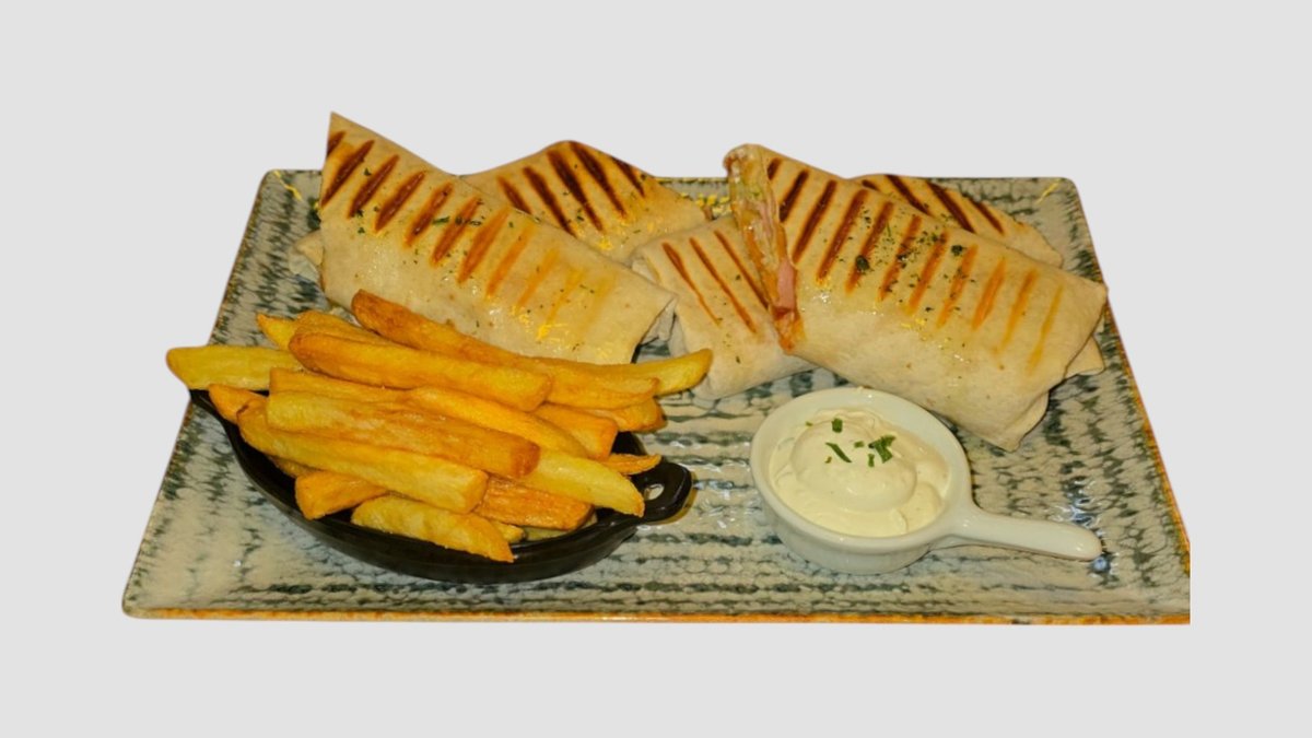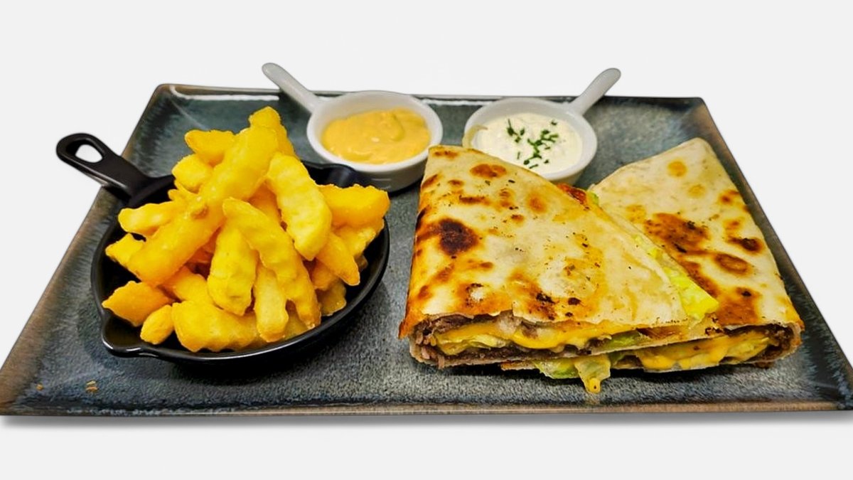Juneće meso, chedar, kačkavalj, mozzarella, salata, tortilja, sendvič sos, Bergamot sos, pomfrit