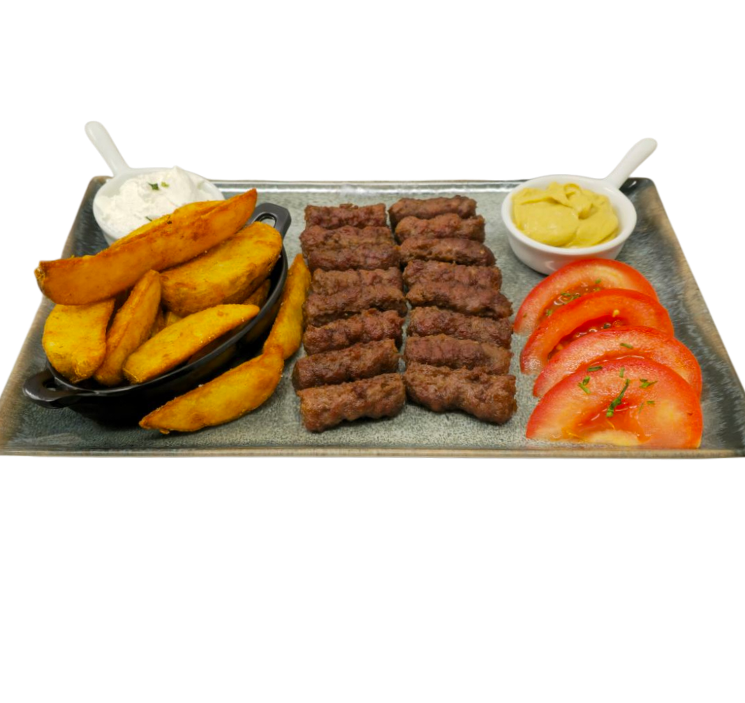 Ćevapi, domaćinski krompir, pavlaka, senf, salata, hleb