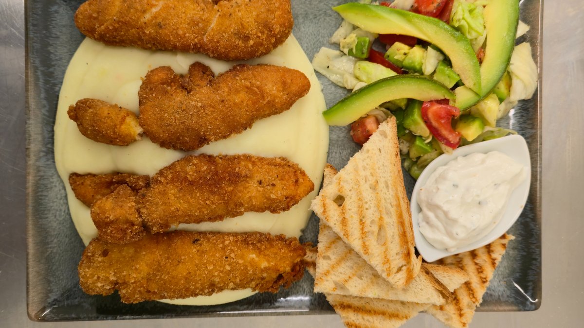 Hrskava piletina, avokado, iceberg, susam, paradajz, krutoni, dresing