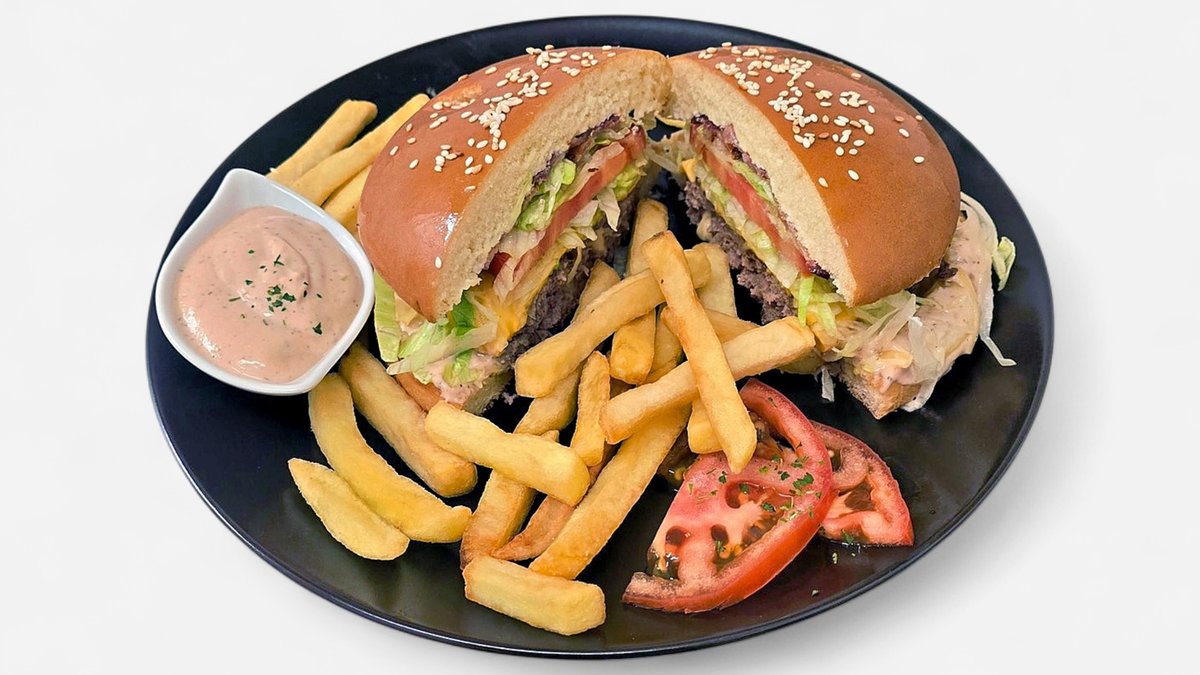 Juneće meso, topljeni chedar, iceberg salata, truffle mayo, paradajz, pomfrit