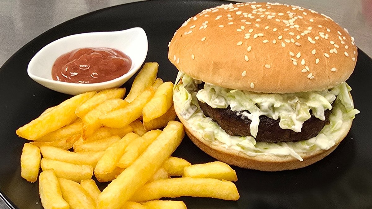 Vege burger, iceberg salata, posni majonez, kiseli krastavci, kečap, pomfrit