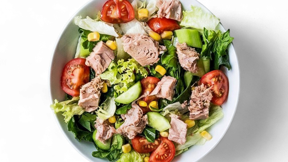 Komadići tunjevine, avokado, iceberg, mix zelenih salata, susam, paradajz, krutoni, dresing