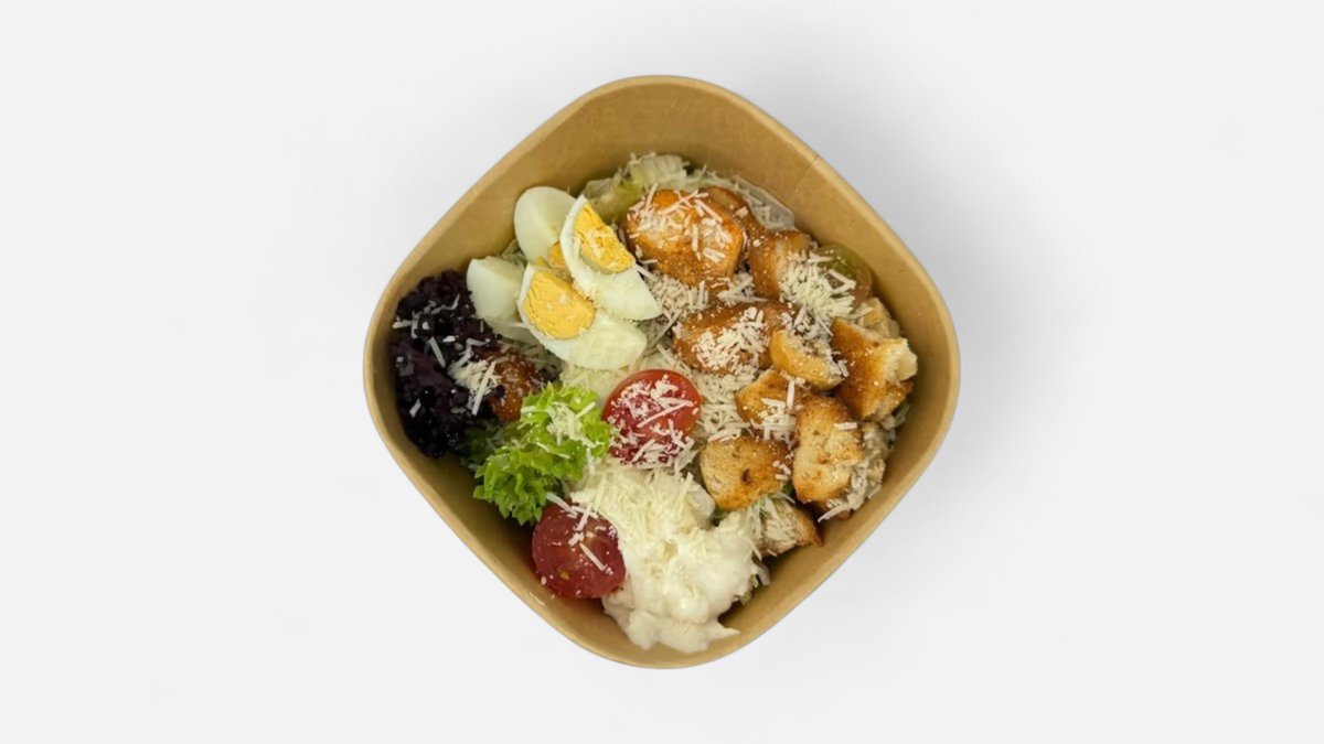 Ajsberg, salatni list (latuk), paradajz čeri, pečeno pileće file, jaje, sir parmezan, suhari, sos Cezar, maslinovo ulje.