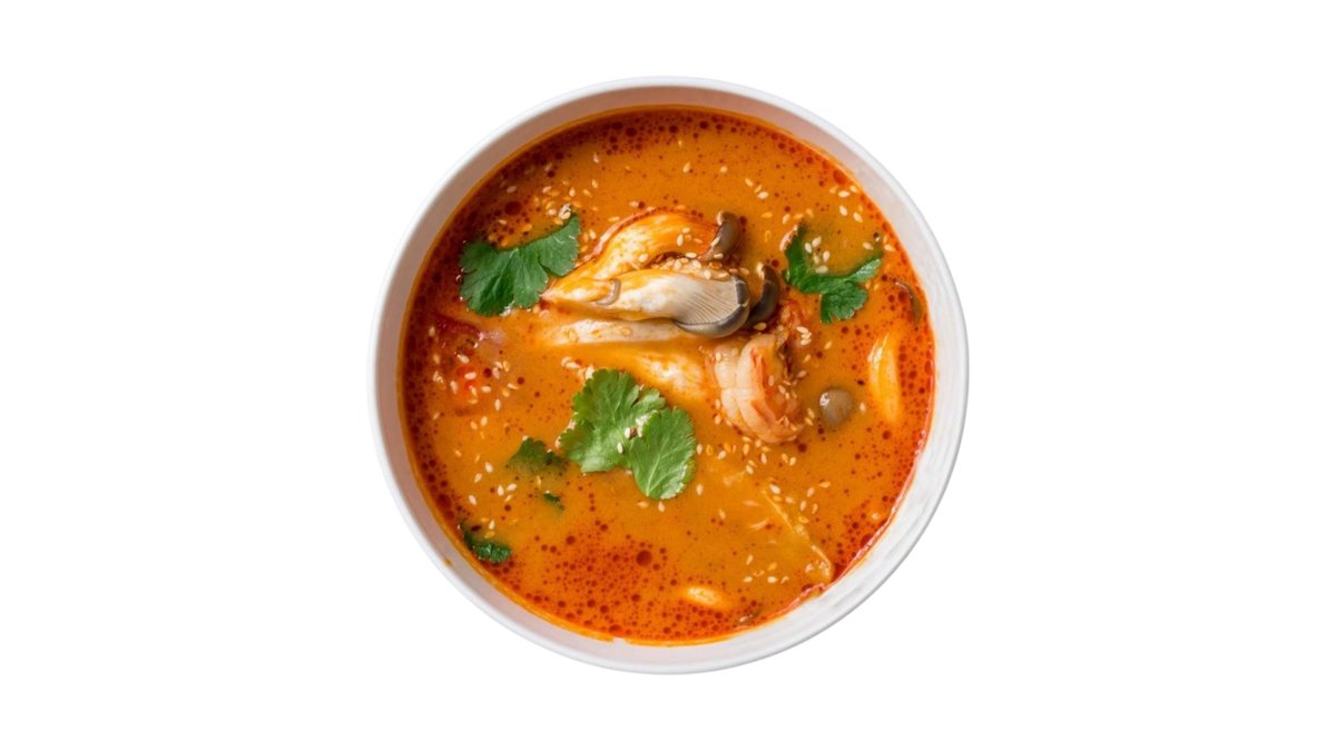 Pileća čorba, tom jam pasta, crvena kari pasta, đumbir, riblji sos, sok od limete, šećer, kokosov krem, škampi, lignje, čeri paradajz, kilantro, pirinač sa zrnima, limun, pečurke, pirinač sa zrnima, pirinčano sirće.