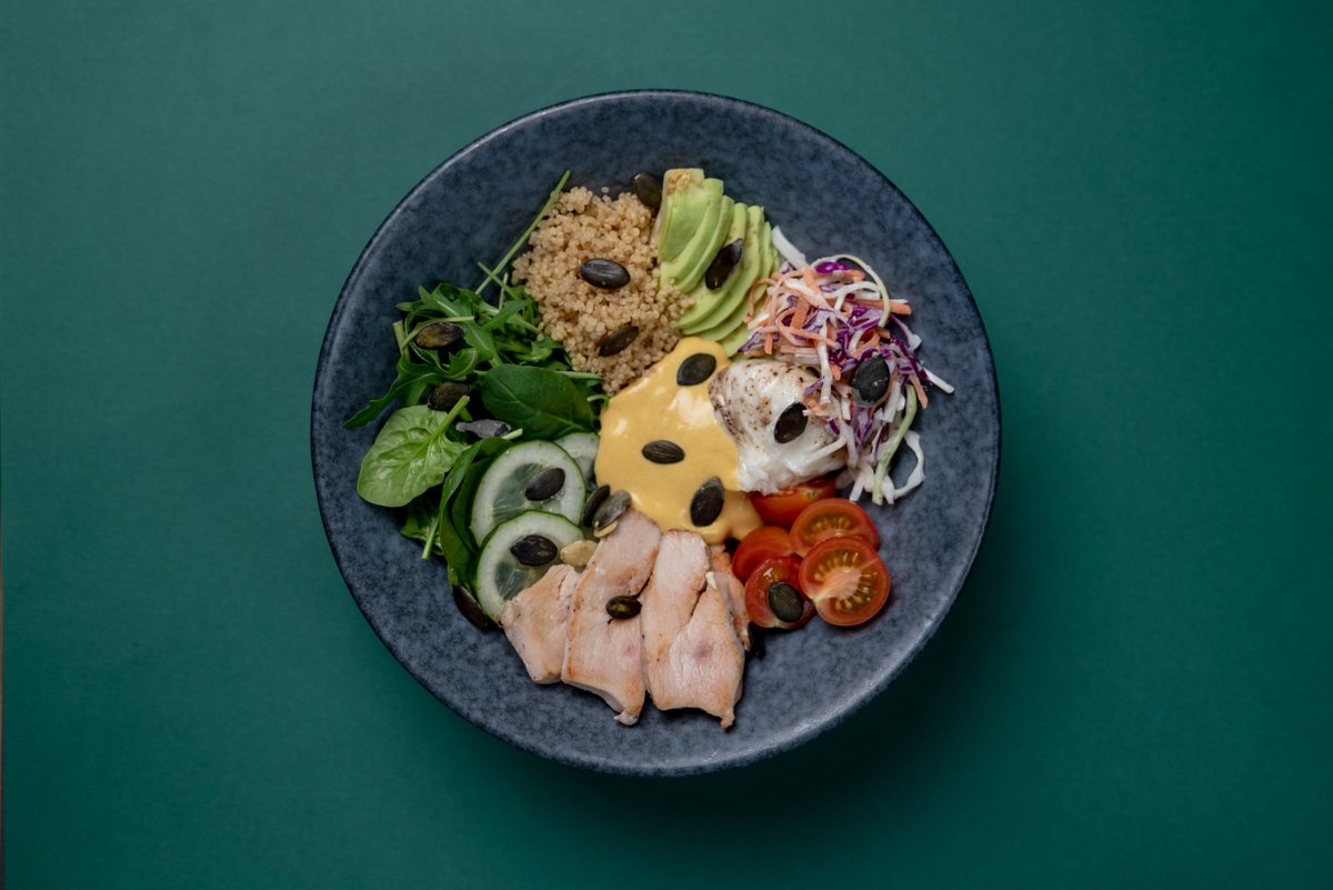Spanać, rukola, krastavac, čeri paradajz, kinoa, poširano jaje, avokado, semenke bundeve, pinjoli, coleslaw, sous-vide piletina (350 g) Prikaz jela prilikom dostave može biti izmenjen