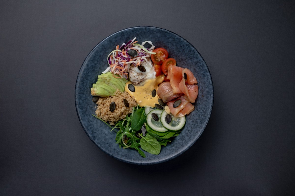 Spanać, rukola, krastavac, čeri paradajz, kinoa, poširano jaje, avokado, semenke bundeve, pinjoli, coleslaw, losos (350 g) Prikaz jela prilikom dostave može biti izmenjen