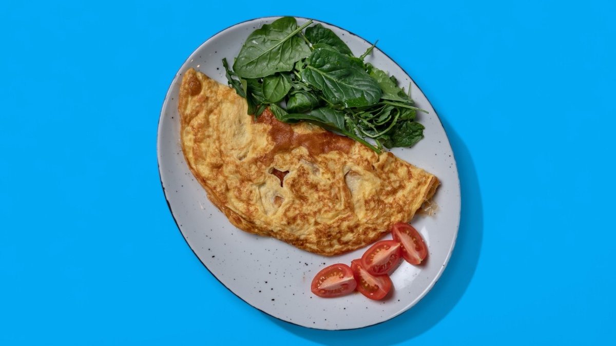 Jaja, čedar, mleko, pavlaka, čeri paradajz, rukola, spanać, suncokretovo ulje, so, crni biber. (220 g) Prikaz jela prilikom dostave može biti izmenjen.