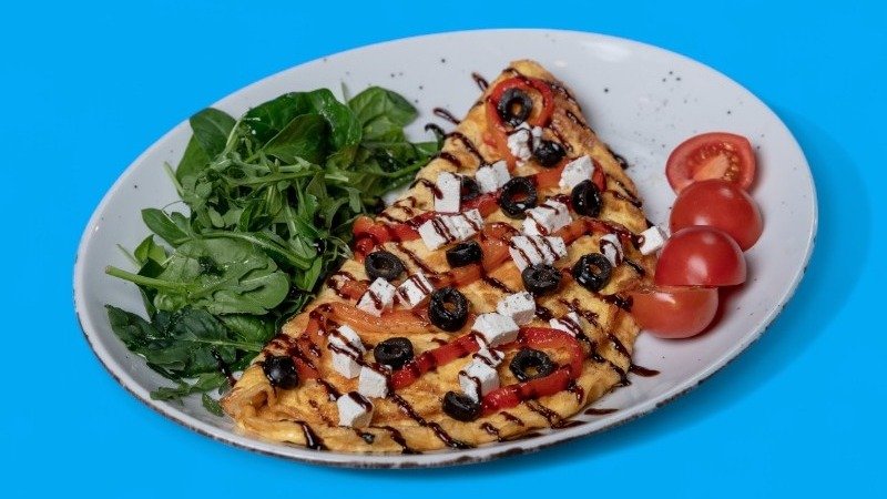 Jaja, feta, pečena paprika, masline, balsamiko krem, mleko, pavlaka, čeri paradajz, rukola, spanać, suncokretovo ulje, so, crni biber. (250 g) Prikaz jela prilikom dostave može biti izmenjen.